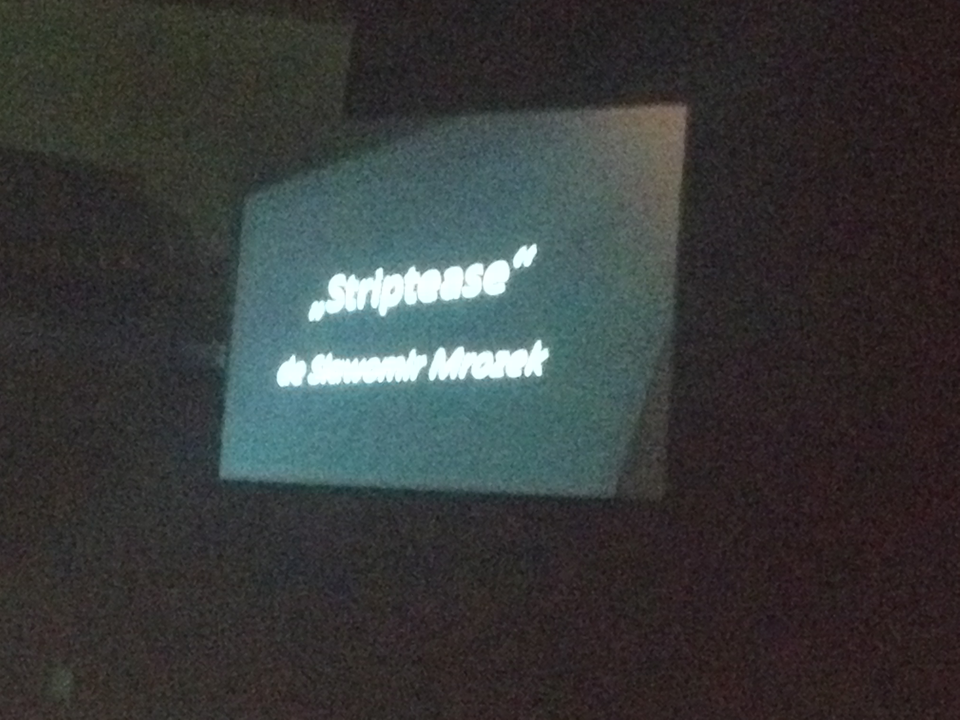 Cea de-a doua creaţie a lui Slawomir Mrozek, piesa „Strip-tease” scrisă în 1961 a fost pusă în scenă de regizorul Tino Geirun alături de Teatrul Pygmalion din Viena, Austria, un spectacol de rezistenţă care, început cu o întârziere de aproximativ 60 de minute, a pus la grea încercare atenţia publicului rămas în sală şi puterea de concentrare a acestuia, pentru că piesa a fost reprezentată în limba germană cu titrare scrisă în limba română. Acţiunea piesei prezintă prin intermediul imaginii absurdului doi bărbaţi introduşi în saci de plastic, abandonaţi, de persoane necunoscute, într-un spaţiu pe care nu au voie sau nu îl pot părăsi cu toate că uşile stau larg deschise. Pe parcursul spectacolului cele două personaje, intelectualul şi activistul, se interpun reciproc, tinzând să convingă unul pe celălalt de aptitudinile lor, luptându-se fictiv cu părăsirea unui spaţiu în care paradoxal uşile sunt deschise, dar un indicator de „Ieşirea interzisă” îi împiedică să iasă.