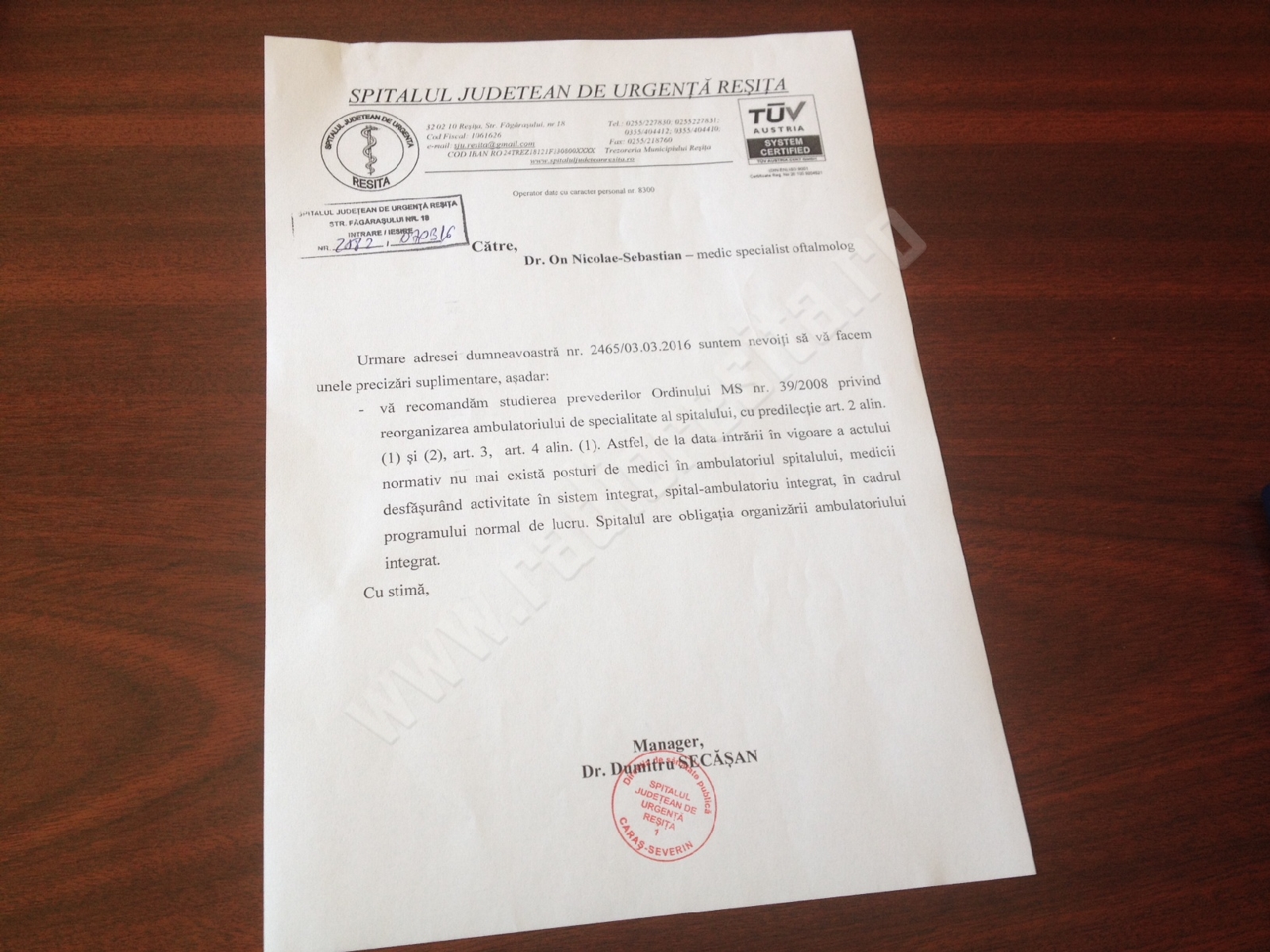 ” Vă rog să înţelegeţi programul întocmit, pur şi simplu nu puteam să-l realizez. O dată pentru că nu aveam aparatura necesară, cea care este acolo este perimată. Au refuzat să-mi prezinte un inventar ca să văd dacă aparatura funcţionează, pentru că eu am constatat că nu toate aparatele funcţionează. Mai mult decât atât, câmpurile vizuale nu sunt efectuate corespunzător şi asta e o investigaţie importantă, chiar eu m-am oferit să aduc pe cineva de la Timişoara ca să învăţăm asistentele să le efectueze, dar orice propunere pe care am avut-o nu a fost respectată. Am fost marginalizat, plasat în afara secţiei într-un aşa zis cabinet în care trebuia să mă şi schimb să şi consult deşi nu aveam aparatură şi evident că în condiţiile astea după ce am fost persecutat timp de 2 luni, în fiecare zi, nimeni nu a venit să rezolve problema. După această situaţie, evident că nu m-am prezentat în luna aprilie la spital. Vine un medic tânăr în judeţ şi este tratat în felul acesta. Menţionez că niciodată nu m-a solicitat un medic din UPU, că asta e procedura şi să zică: domnule doctor este o urgenţă! În programul respectiv mă trece pe mine să asigur asistenţa medicală de urgenţă în weekend în condiţiile în care noi nu avem o linie de gardă. Mai mult decât atât nimeni nu menţionează ce se întâmplă după ora 13.00 cu pacienţii. Nu mi s-a arătat un registru în care să-mi trec pacienţii. Şi instructajul la locul de muncă, dr Quint a refuzat să mi-l facă. Şi mă surprinde că au continuat în ritmul acesta să mă forţeze să-mi dau demisia, lucru pe care am refuzat să îl fac. Eu eram singur acolo, ei au fost mulţi împotriva mea, dar am încredere că organele judiciare de la noi îşi vor face treaba. Repet n-am avut dotarea tehnică necesară, nici nu ştiu dacă toată aparatura aparţine secţiei pentru că nu mi s-a prezentat un inventar. Eu am constatat că aparatura lasă de dorit. Eu nu puteam să consult cu un biomicroscop din 1952, pe acolo datează data fabricaţiei. Nu puteam să consult în ambulatoriu pentru că nu mă găseam în raportul contractual cu Casa, în schimb doamnei dr Qiunt i se permite să aibă contract cu CJAS la cabinetul privat dar şi în spital…şi atunci mi s-a părut o discriminare. În plus dacă lucrez cu aparatură perimată eu sunt răspunzător de sănătatea pacienţilor. La sala de operaţii, la fel, nu am o trusă de microchirurgie pe care să o pot utiliza. Situaţia este gravă, eu nu am paturile mele, mi s-a spus să fac internare doar pe programare. Eu nu înţeleg cum vine asta. Medicul este liber profesionist. „