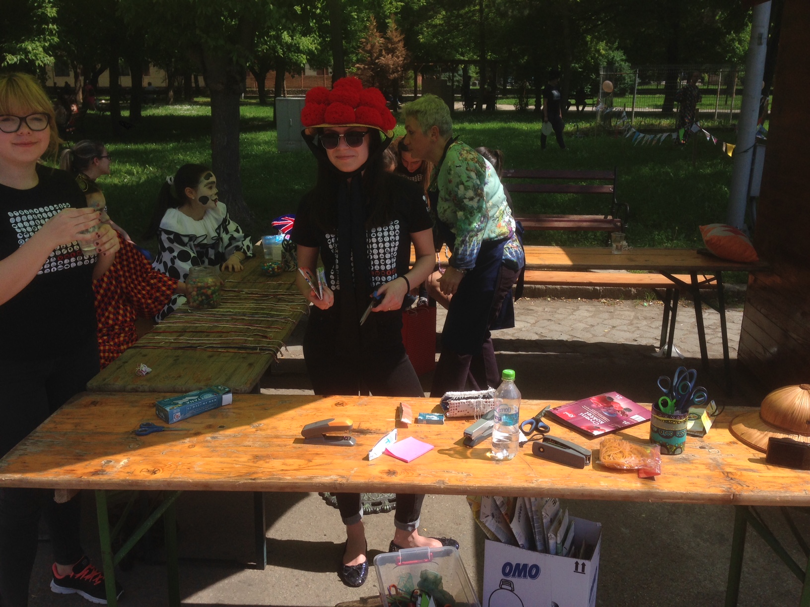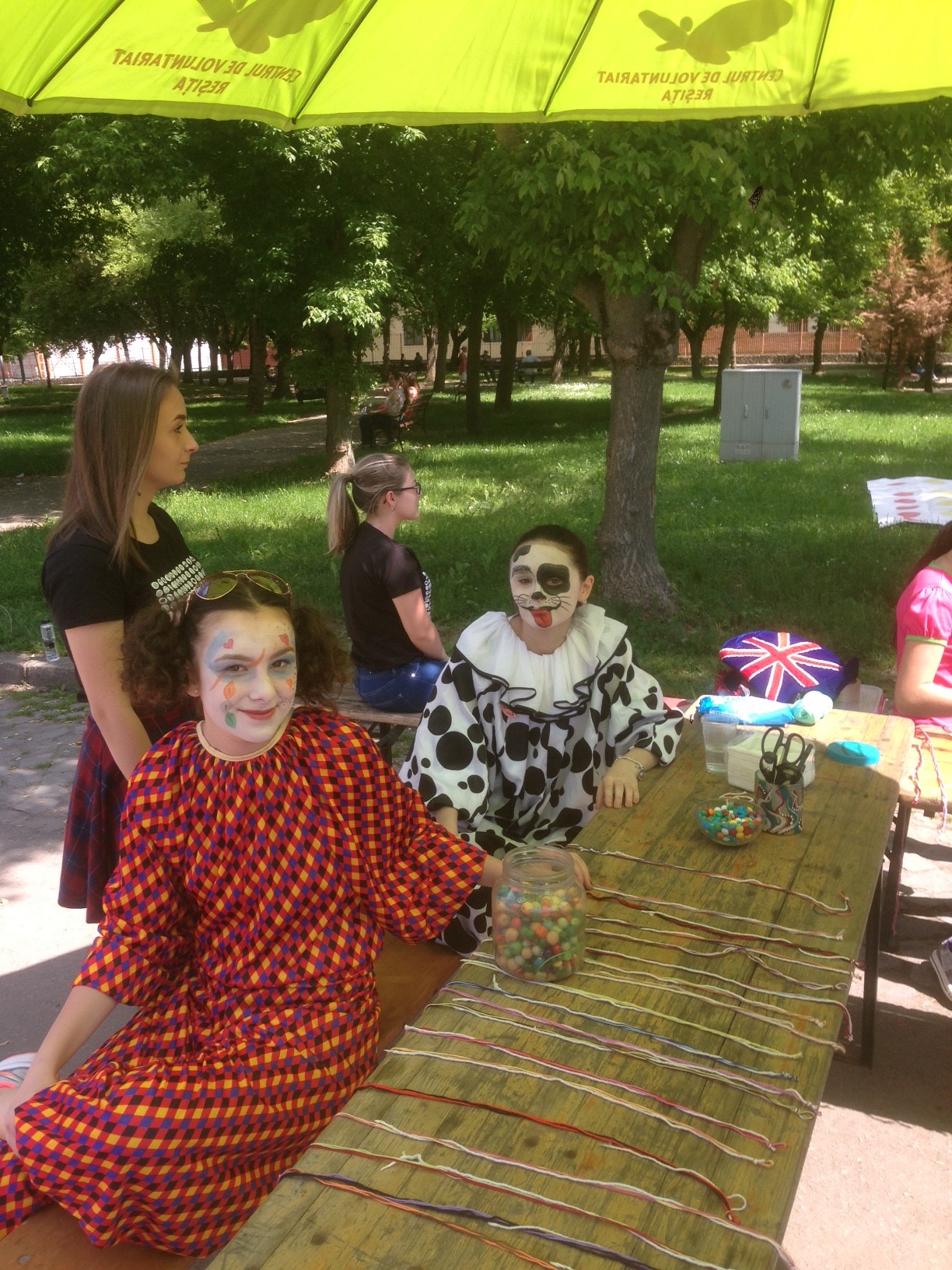 “Astăzi suntem cu atelierele noastre tradiţionale în mijlocul aleii, noi spunem că este aleea voluntarilor. Vrem să prezentăm cumva oferta noastră de voluntariat, ce facem noi în mod curent atunci când suntem invitaţi la un eveniment sau când noi avem activităţi. Facem face-painting, învăţăm copiii şi tinerii poate chiar părinţii să recicleze cutiile de suc şi de lapte şi să îşi facă un portofel. Avem atelierele de iniţiere în arta circului, model în baloane, împletim brăţări, twister şi multe alte jocuri.”