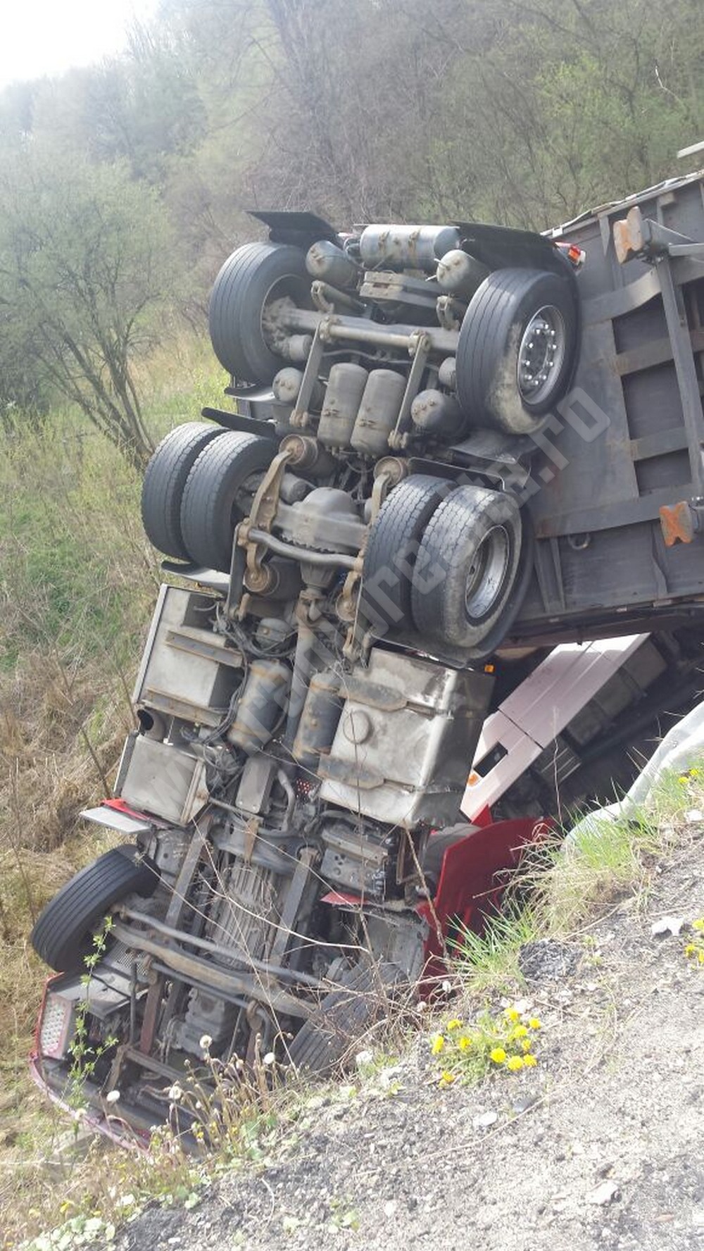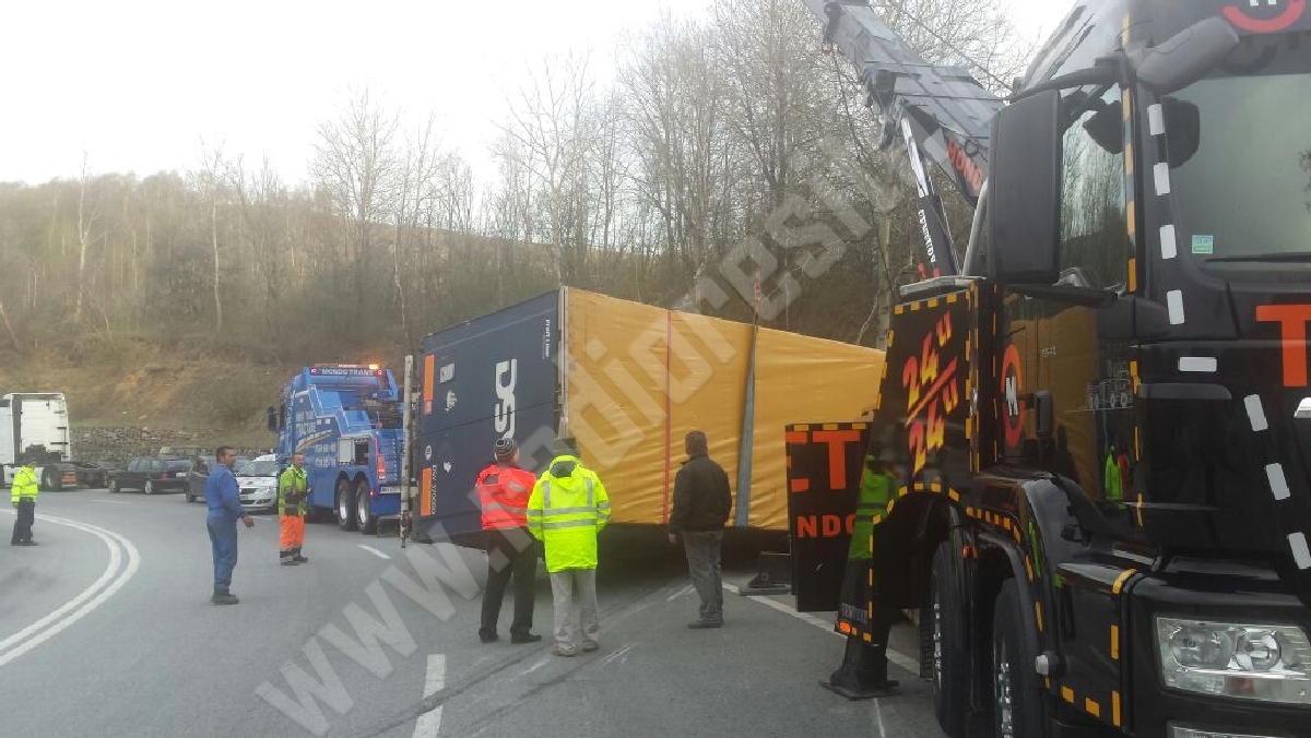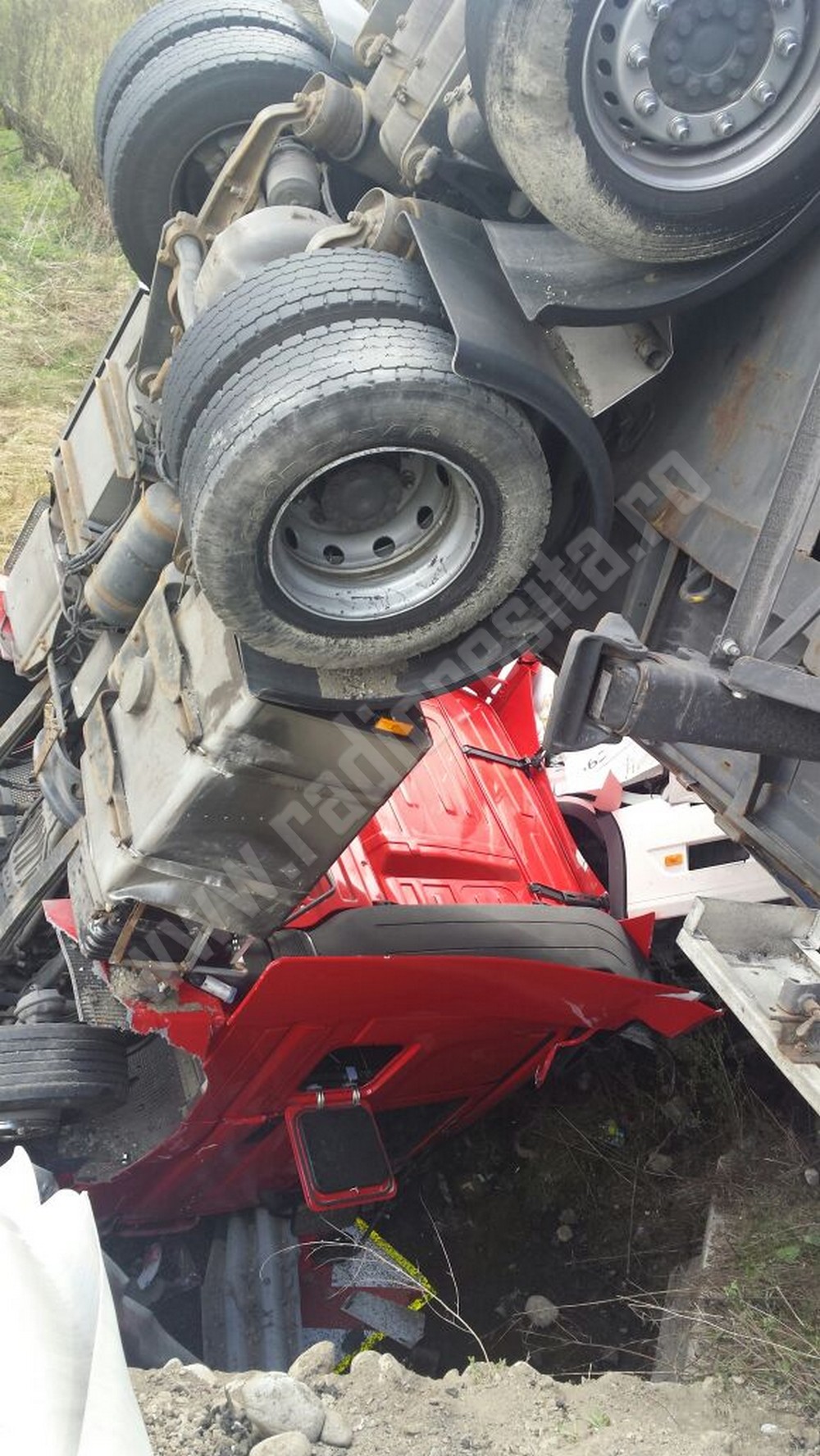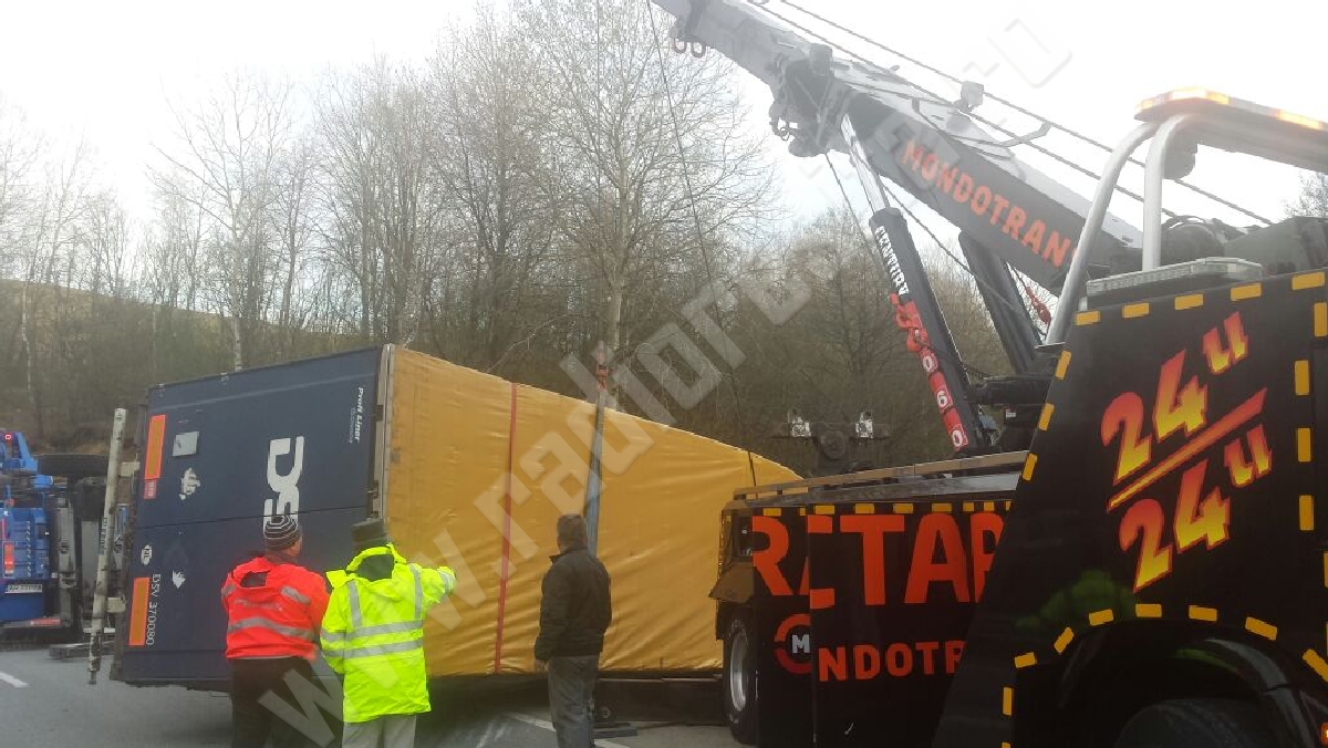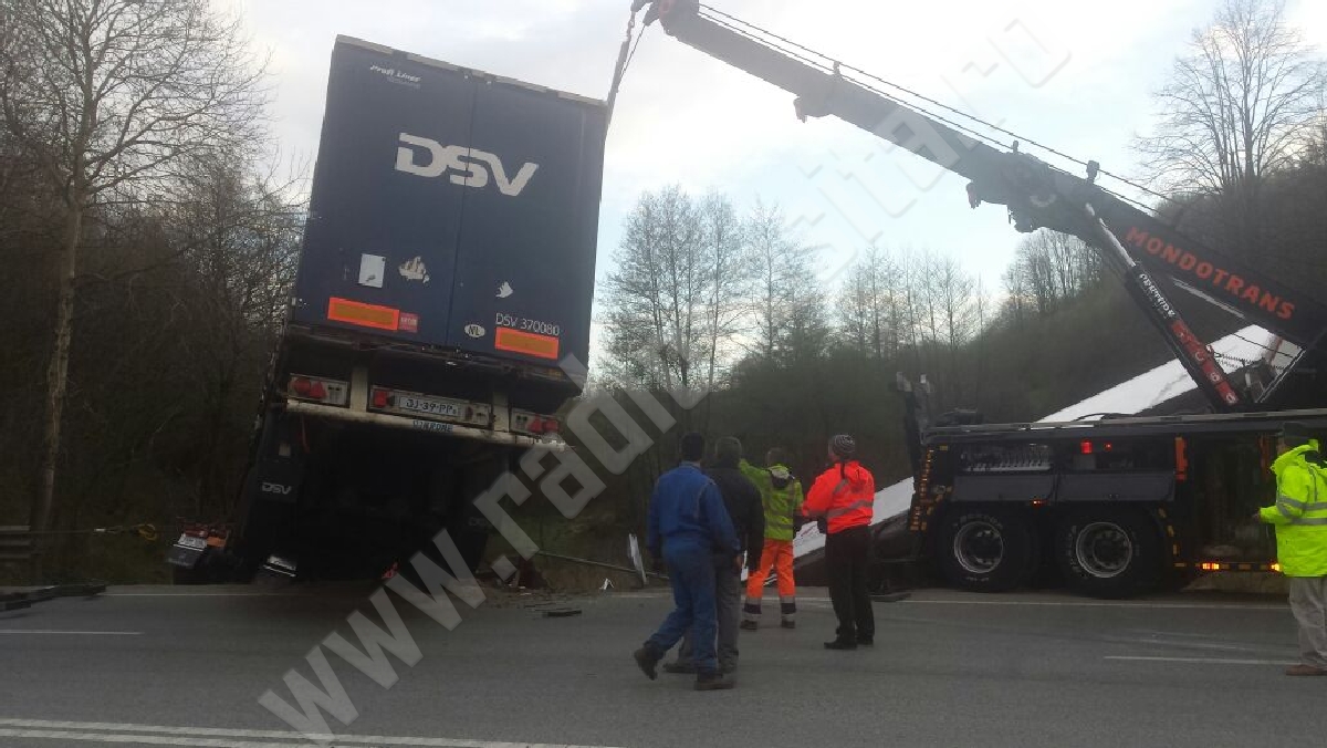 Pentru ridicarea celor două TIR-uri a fost desfăşurat un adevărat detaşament, deoarece aceste maşini de zeci de tone au dat bătăi de cap lucrătorilor.