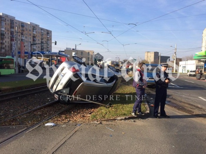 Conducătorul unui microbuz Ford a lovit un autovehicul marca Opel răsturnându-l între liniile de tramvai. Din fericire, șoferul autovehiculului Opel a ieșit nevătămat din mașină fiind doar ușor lovit la cap.