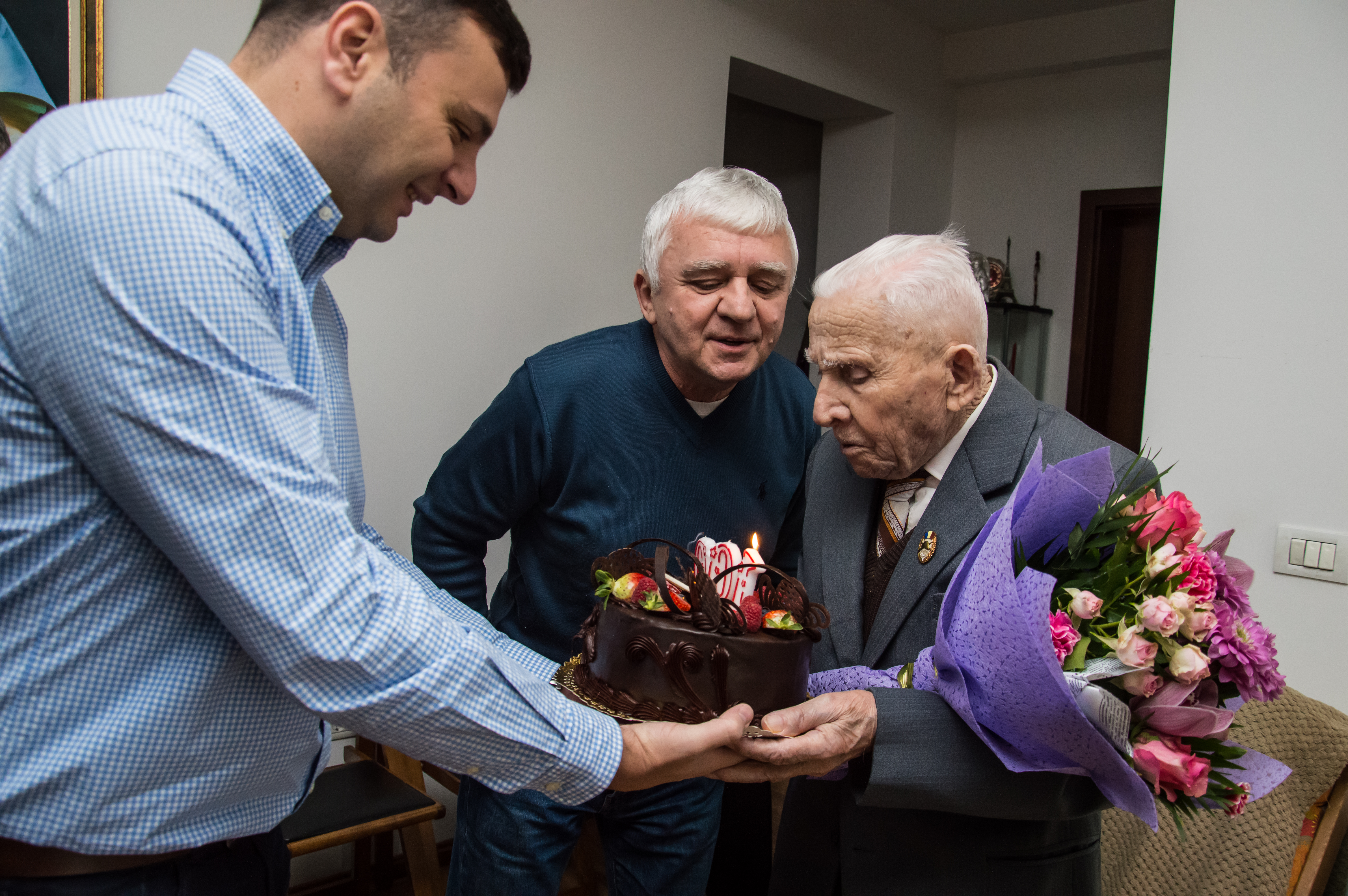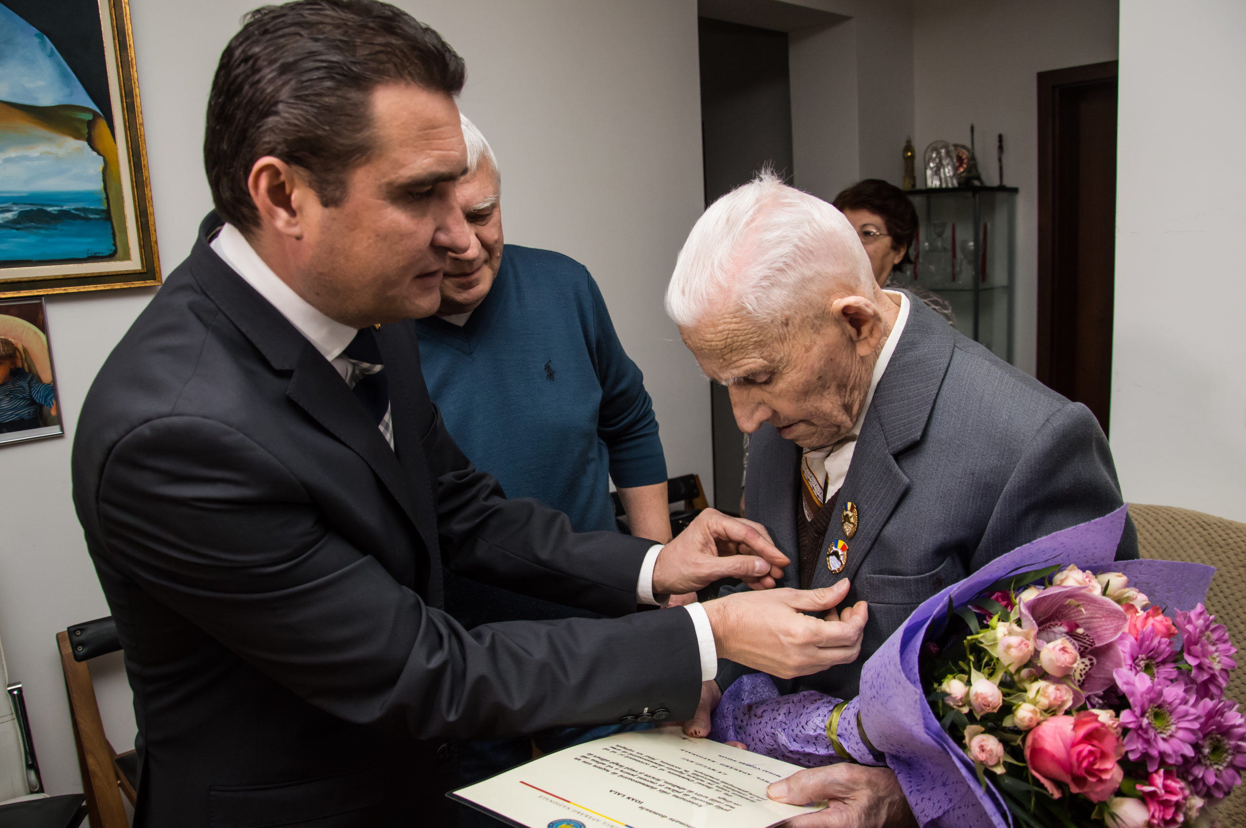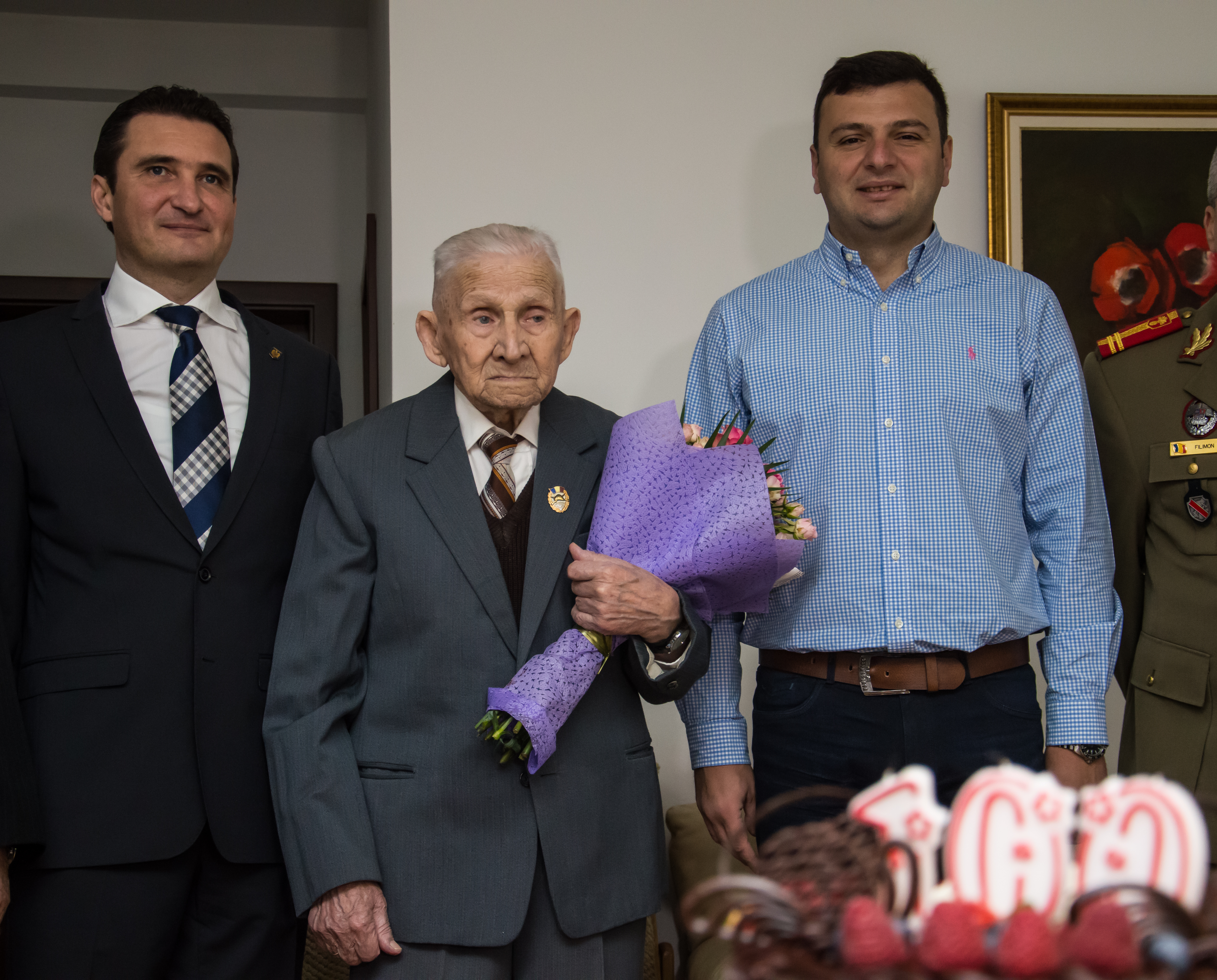 Lor li s-au alăturat viceprimarul municipiul Arad, Călin Bibarţ, vicepreşedintele Consiliului Judeţean Arad, Sergiu Bâlcea şi președintele Filialei ANVR „Zărandul” Arad, col Ioan Gliga. În semn de respect şi apreciere, reprezentanţii autorităţilor locale i-au oferit domnului Lala un tort aniversar şi un buchet de flori. Îmbrăcat elegant, cu costum şi cravată, veteranul i-a răsplătit cu un zâmbet larg de încântare şi câteva sfaturi de viaţă. Nu au lipsit însă nici momentele emoţionante.