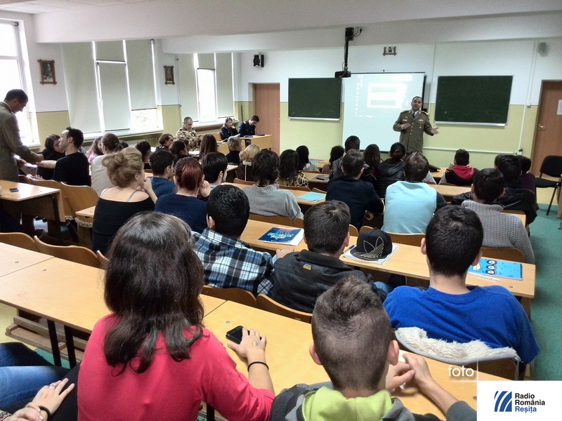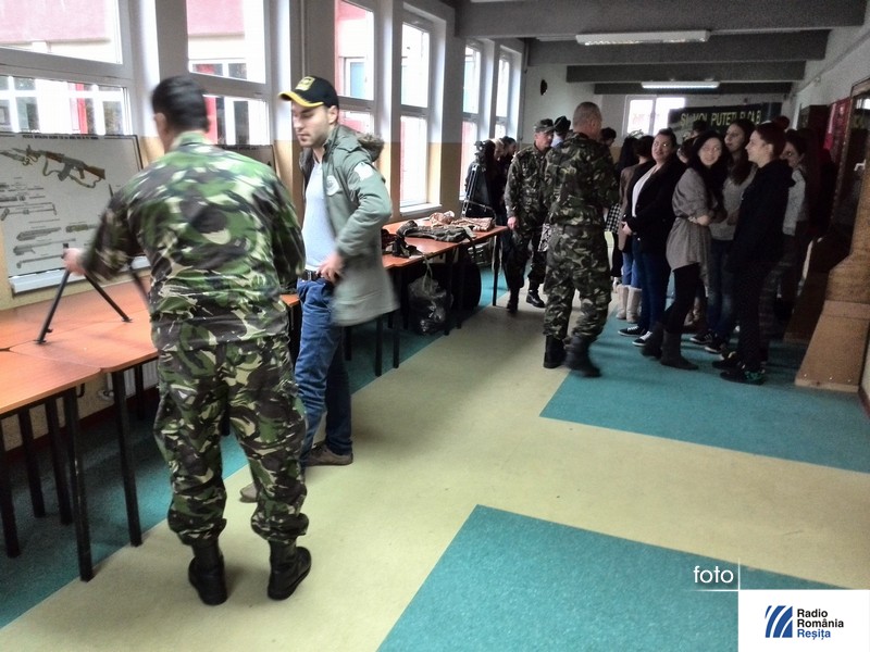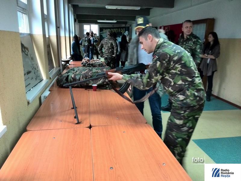 În cadrul evenimentului organizat de Ministerul Apărării Naţionale – „Armata României în şcoli”, membrii biroului informare – recrutare de la Centrul Militar Judeţean Caraş-Severin s-au aflat ieri în Colegiul Naţional „Traian Lalescu” din Reşiţa, astăzi în Colegiul Naţional „Mircea Eliade” din Reşiţa, iar mâine îşi vor desfăşura activitate în Liceul Teoretic „Traian Vuia” din Reşiţa. Caporalul Florin Bureţea, de la Unitatea Militară 0.12.20 – Lugoj a explicat pentru Radio România Reşiţa ce presupune această activitate şi ce armament s-a prezentat astăzi liceenilor de la „Mircea Eliade”.
