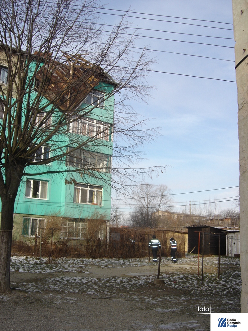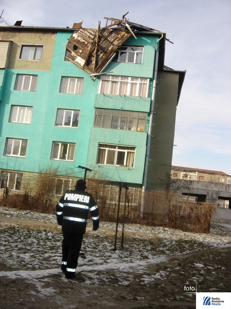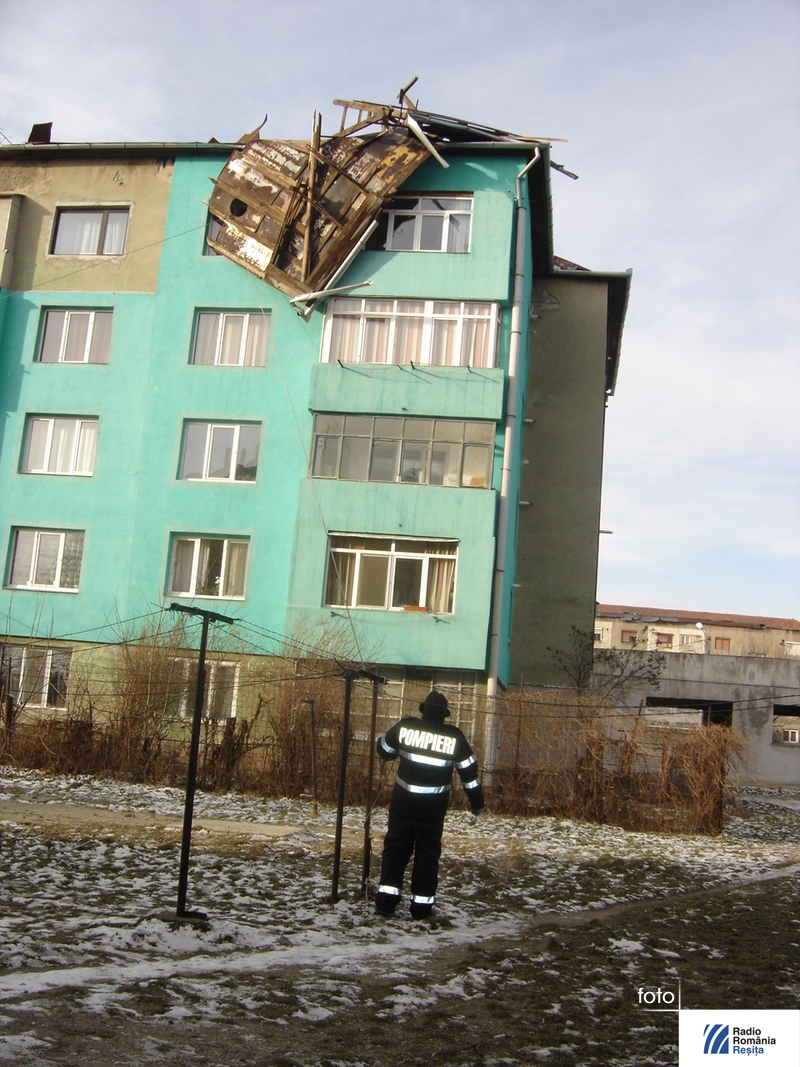 Acoperişul unui bloc din cartierul Balta Sărată al municipiului Caransebeş a fost luat de vânt, iar bucăţi mari din acesta atârnă la nivelul geamurilor de la etajul IV al imobilului.