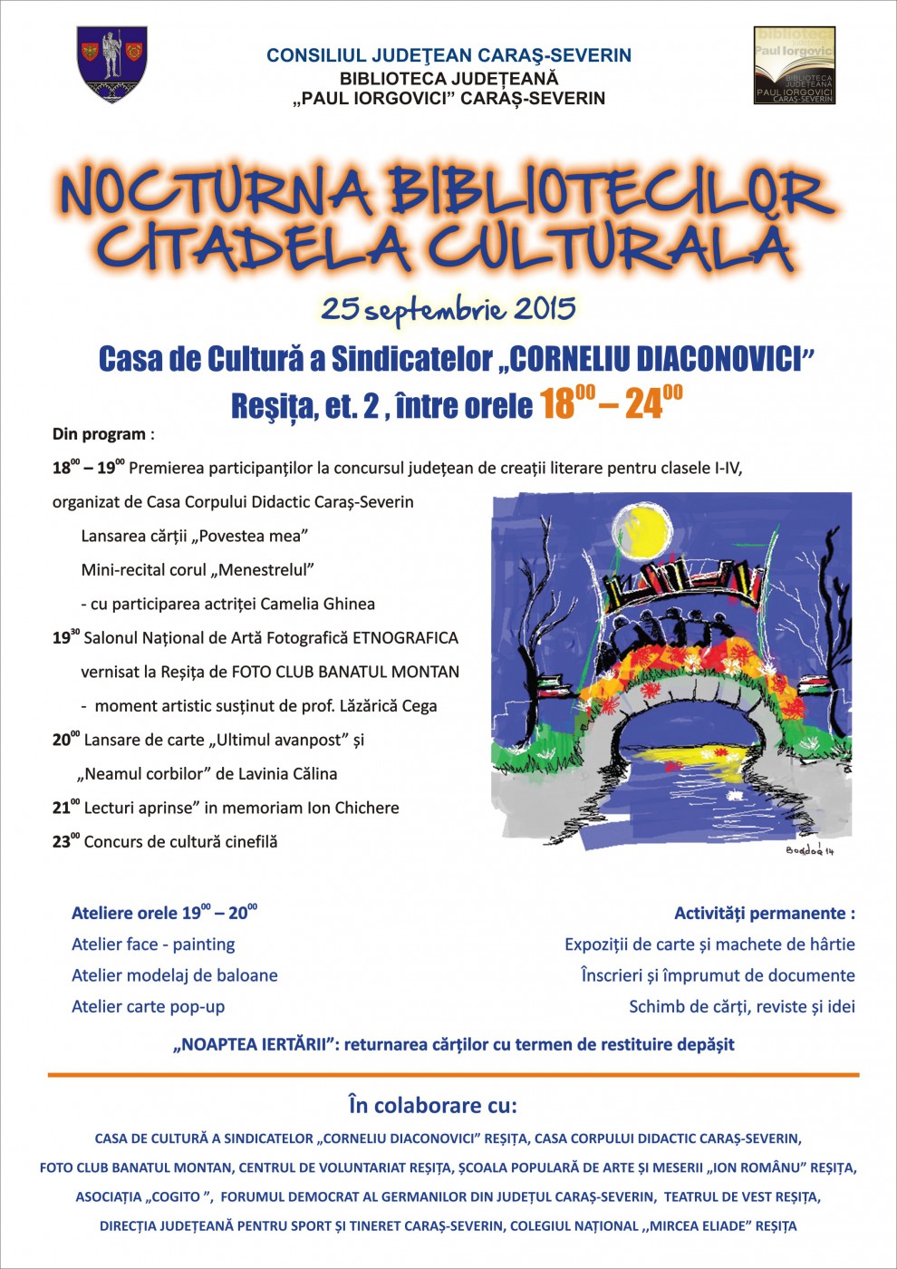 Biblioteca Judeţeană “Paul Iorgovici” din Reşiţa organizează o serie de manifestări între orele 18.00 – 24.00. Astfel, secţiile de la etajul 2 din incinta Casei de Cultură a Sindicatelor vor avea porţile deschise, în program fiind incluse lansări de carte, concerte, expoziţii de carte şi de fotografie, recitaluri de poezie, ateliere creative, jocuri de societate şi, în premieră, un concurs pentru tinerii cinefili. Pe tot parcursul “Nocturnei” se pot împrumuta și returna cărți şi se poate accesa Internetul. De asemenea se primesc donații de carte şi vor fi oferite cărți în dar.