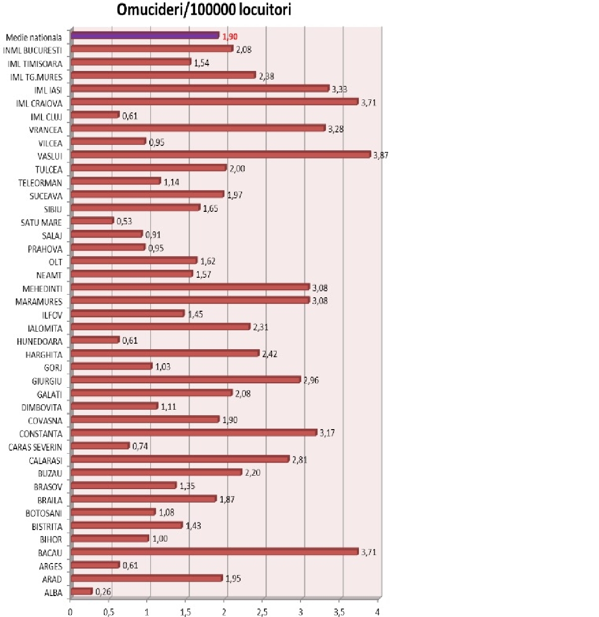 Statisticile arată că cel mai sigur judeţ este Alba, acolo unde anul trecut incidenţa omuciderilor a fost de 0,26 la 100.000 de locuitori. Pe locul doi din punct de vedere al siguranţei este judeţul Satu Mare, cu o rată a omuciderilor de 0,53 la sută, urmat de Hunedoara şi Cluj. În judeţul Caraş-Severin, anul trecut au avut loc doar o infracţiune de omor, o tentativa de omor şi un caz de lovire sau vătămare cauzatoare de moarte. Ceea ce înseamnă o rată a omuciderilor de 0,74 la suta de mii de locuitori. În Arad se înregistrează 1,95 omucideri la 100.000 de locuitori, iar în Timiş, 1,54. Cele mai multe cazuri din regiune au fost înregistrate în Mehedinţi cu 3,08 omucideri la 100.000 de locuitori. La nivel naţional, în top se află judeţele Vaslui şi Bacau.