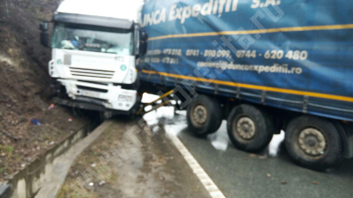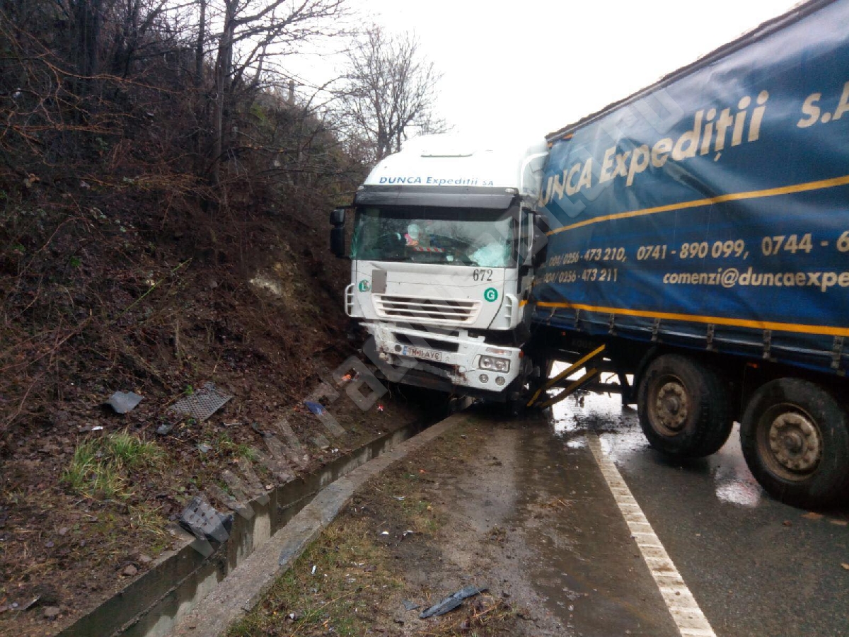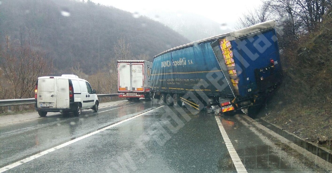 Şoferul unui tir nu a adaptat viteza la condiţiile de drum umed, a derapat şi a intrat cu camionul pe contrasens, după care a lovit o stâncă. Evenimentul a avut loc la ieșirea dintr-o curbă la stânga. Accidentul nu s-a soldat cu victime, ci numai cu pagube materiale.