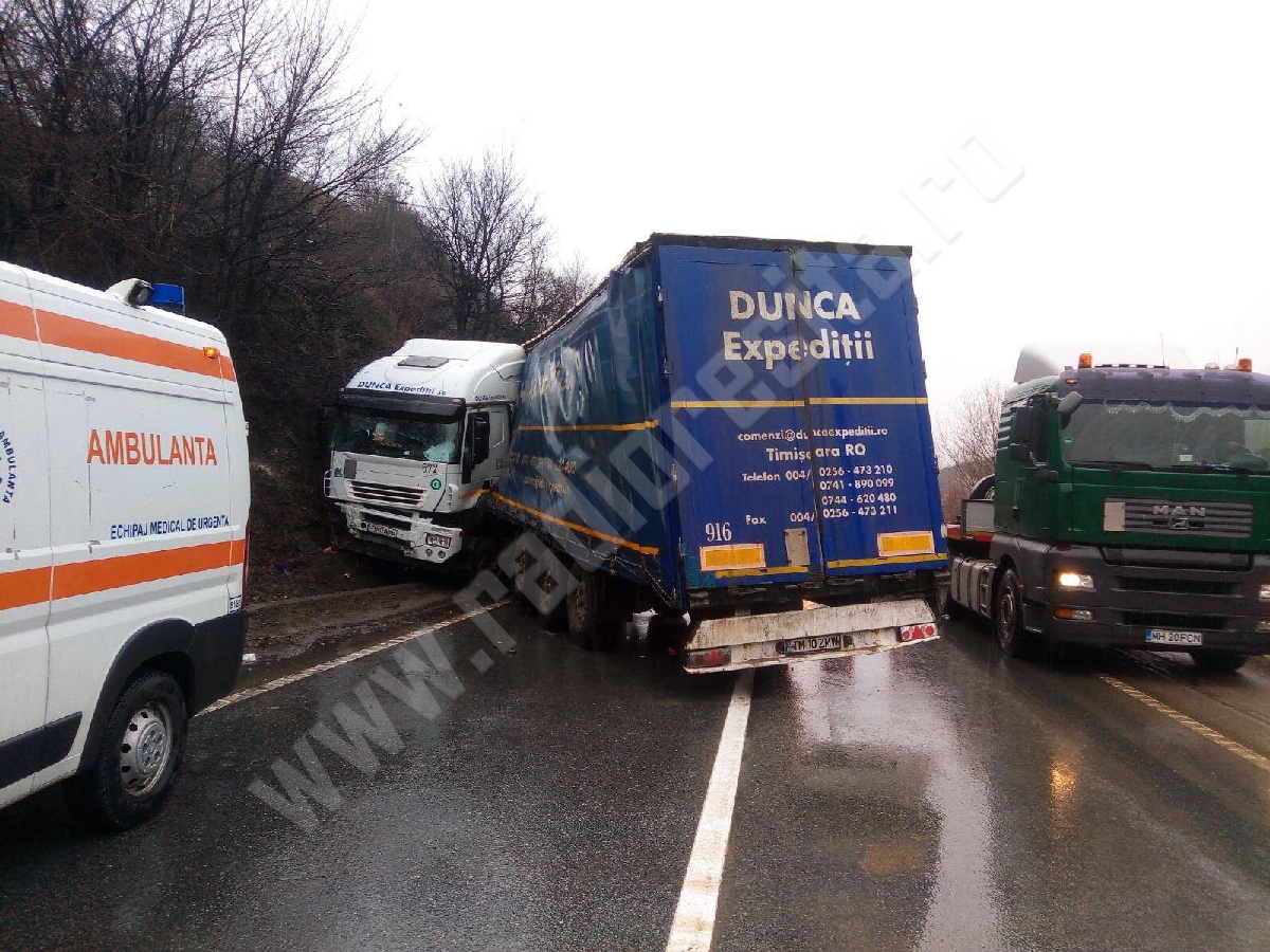 Semiremorca tirului blochează sensul de mers Caransebeş-Orşova, ne-a informat Stelian Cornea de la serviciul rutier Caraş-Severin.