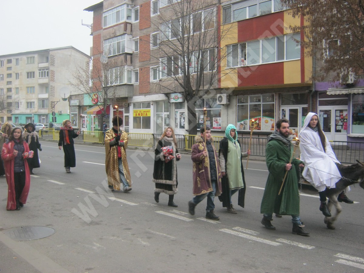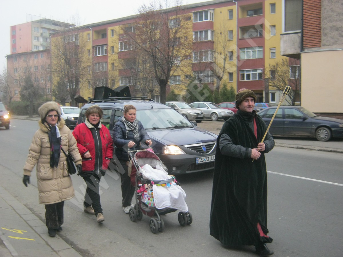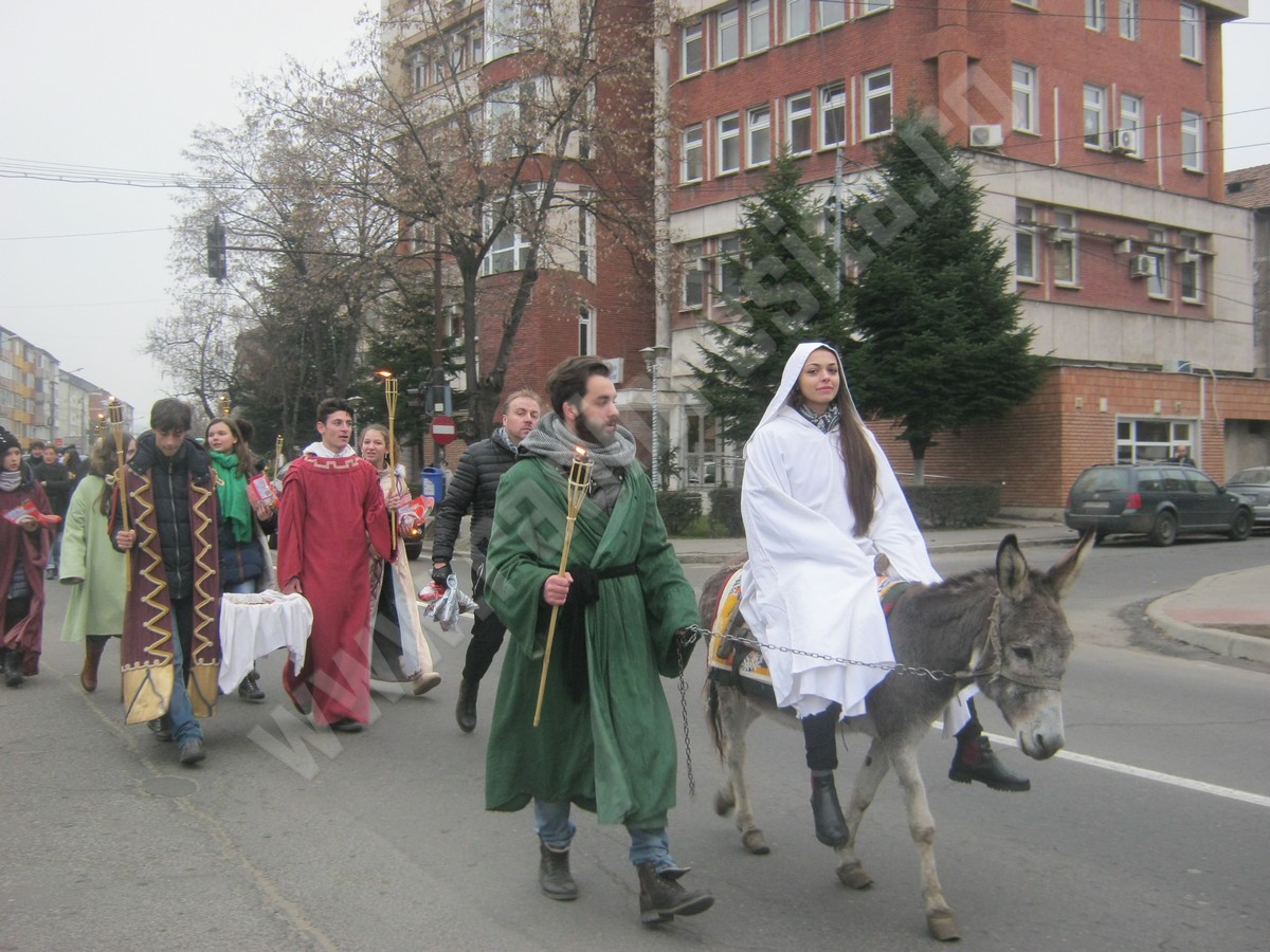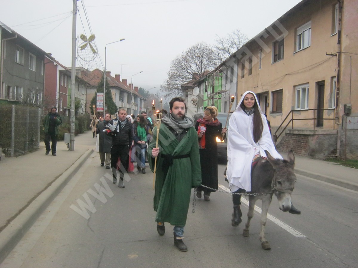 O iniţiativă inedită a Teatrului de Vest Reşiţa a adus ieri oamenilor zâmbete şi bucurie pe arterele principale ale municipiului de pe Bârzava. Actorii, colaboratorii şi copii Cercului dramatic al Teatrului au format un alai costumaţi în personaje biblice şi au parcurs într-un pelerinaj-spectacol „Drumul Fecioarei Maria prin Betleem”. Cu torţe în mâini ei au evocat în acest fel cel mai important eveniment din istoria creştinătăţii. Trupa de actori a împărţit oamenilor de pe stradă cozonaci şi bomboane de ciocolată, mulţumind publicului că i-a fost alături în acest an, la spectacolele şi acţiunile instituţiei, aşa cum a declarat directorul artistic al Teatrului de Vest, actorul Dan Mirea: