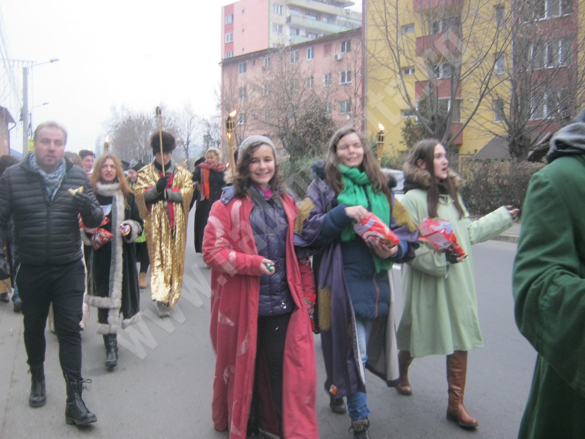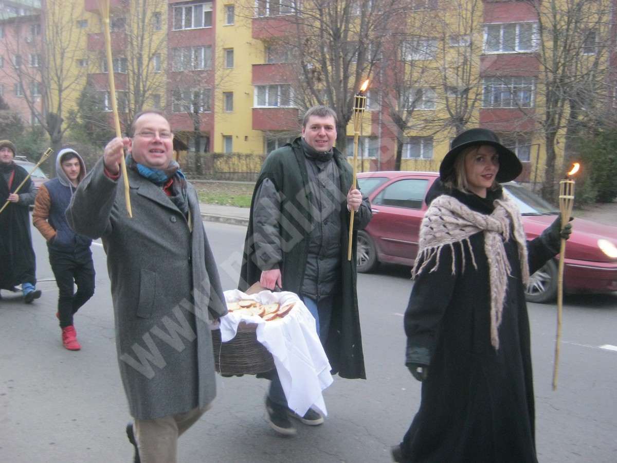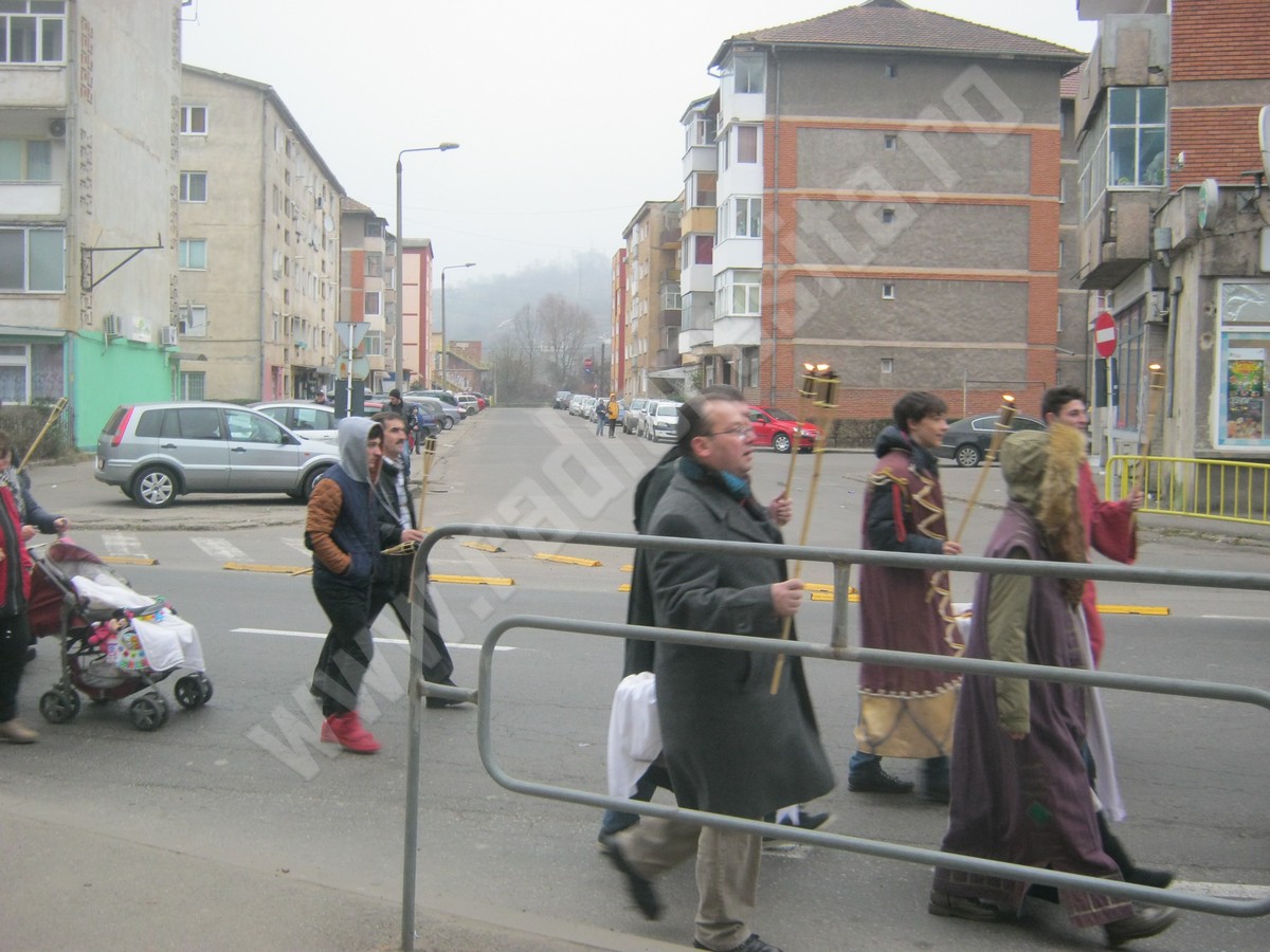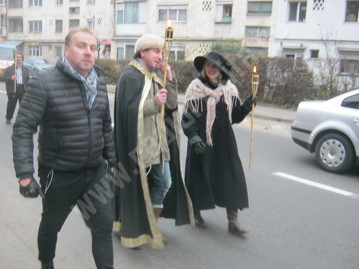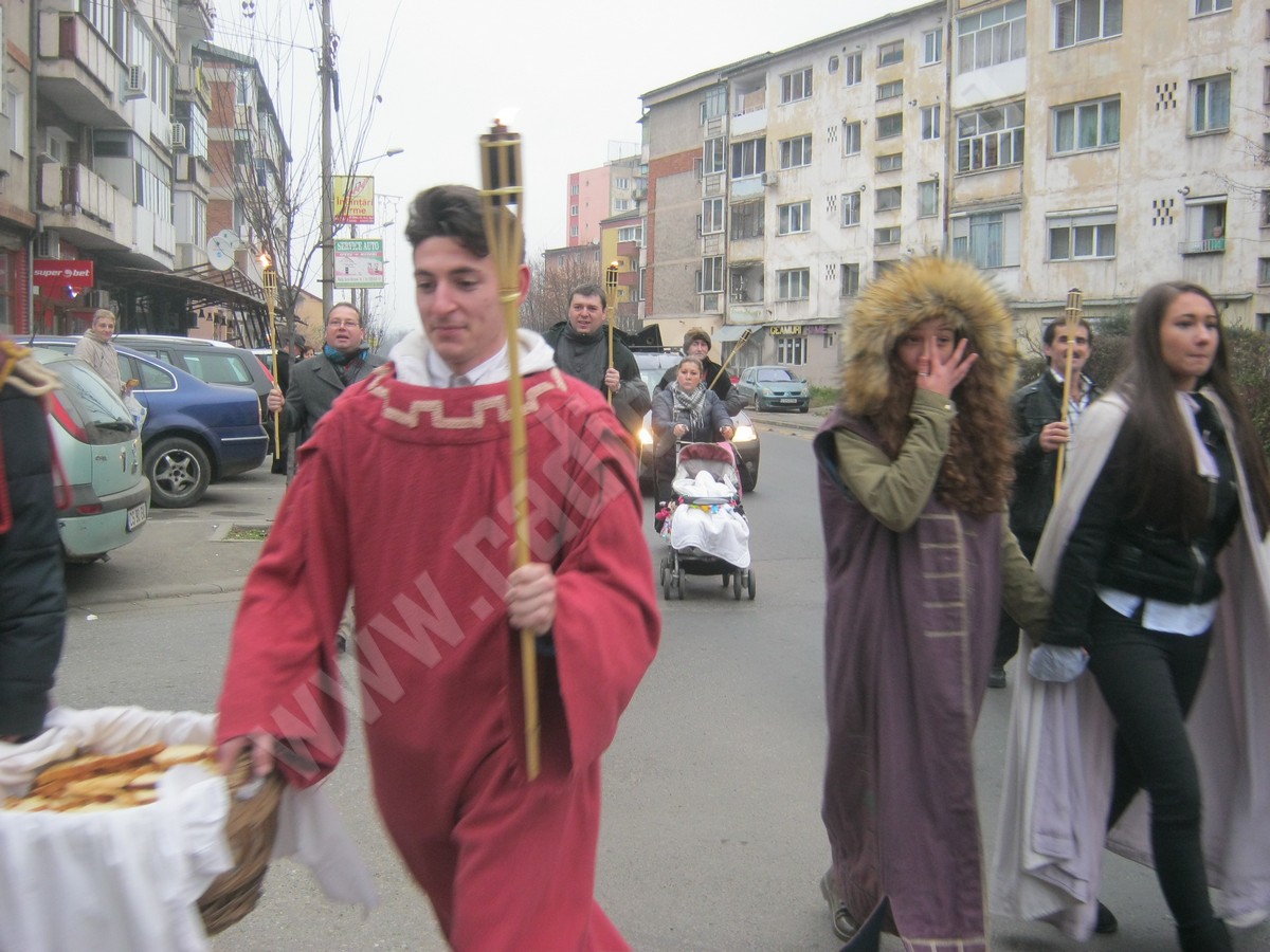 O iniţiativă inedită a Teatrului de Vest Reşiţa a adus ieri oamenilor zâmbete şi bucurie pe arterele principale ale municipiului de pe Bârzava. Actorii, colaboratorii şi copii Cercului dramatic al Teatrului au format un alai costumaţi în personaje biblice şi au parcurs într-un pelerinaj-spectacol „Drumul Fecioarei Maria prin Betleem”. Cu torţe în mâini ei au evocat în acest fel cel mai important eveniment din istoria creştinătăţii. Trupa de actori a împărţit oamenilor de pe stradă cozonaci şi bomboane de ciocolată, mulţumind publicului că i-a fost alături în acest an, la spectacolele şi acţiunile instituţiei, aşa cum a declarat directorul artistic al Teatrului de Vest, actorul Dan Mirea: