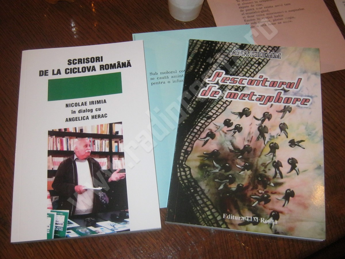 Una din activităţile constante ale Casei de Cultură a Sindicatelor se regăseşte în dimensiunea literară pe care Reşiţa o are la cenaclul „Semenicul” în fiecare seară de joi, când se lasă „întunericul de ora şapte”. Un motiv în plus ca o carte de poezie să fie lansată în această zi într-un decor autentic de toamnă, cu file răsfirate printre frunze şi crizanteme. Dar şi o carte în gen epistolar cu şi despre un poet jurnalist, absent, din păcate, doar fizic, din motive de sănătate. Şi un alt motiv în plus ca Sala Albastră II a cenaclului „Semenicul” să fie din nou plină până la refuz, pentru a păstra tradiţia cenacliştilor de a se aduna în număr mare doar la asemenea manifestări. De data aceasta însă, au venit şi profesori mulţi, fiindcă una dintre autoare, deşi a fost poetă mai întâi, şi-a dedicat viaţa catedrei, fără să-şi părăsească, totuşi muza. A fost, dealtfel şi profesoara celeilalte autoare. Aşadar, am avut de-a face cu o dublă lansare de carte, ca de la profesor la elev, dar şi invers, pentru că elevul a vorbit despre profesor. Şi ambele cărţi au fost publicate la Editura reşiţeană „Tim”, al cărui director este şi şef de cenaclu – Gheorghe Jurma – deci, a moderat şedinţa festivă la care, de asemenea, pentru a se păstra tradiţia lansărilor, nimeni n-a îndrăznit să critice aspru în maniera tipică semenicanilor. Cine sunt autoarele şi care sunt cărţile? În ordinea intrării în „scenă” Ana Kremm, iar cartea „Pescuitorul de metaphore”: