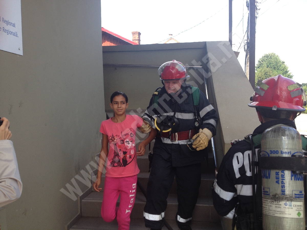 După evacuarea persoanelor din clădire, exerciţiul a continuat cu acordarea de prim ajutor de către voluntarii de la Crucea Roşie, celor care au suferit arsuri în urma incendiului.