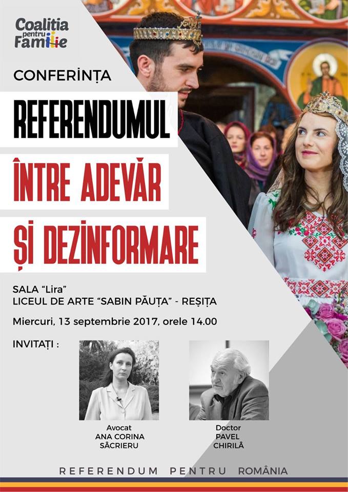 „Aș sublinia faptul că această Coaliție pentru Familie nu are nici măcar un statut juridic și reunește mai multe ONG-uri și personalități din diverse domenii de activitate.care au aderat la această inițiativă civică de schimbare a Constituției. Nu este nici pe departe vorba de un ONG și aș vrea să se înțeleagă foarte bine mesajul acesta în mediile din care veniți că nu este o inițiativă a Bisericii. O susținem evident, dar nu am vrea să se confunde cu o politică a Bisericii.Este un proiect al societății civile din România la care Biserica a răspuns pozitiv. Noi suntem parteneri în acest proiect. Vă mulțumesc că sunteți aici atât părinților de la Biserica Ortodoxă și Catolică, dar și celor de cultul neoprotestant.Vă aşteptăm la  conferința susținută de Dr. Pavel Chirilă, pe tema Referendumului pentru modificarea Art. 48 din Constituția României, ce  va avea loc miercuri 13 Septembrie, ora 14, la Sala Lira a Liceului de Arte „Sabin Păuța” Reșița. Un demers pentru NORMALITATE și FIRESC, al Coaliției pentru Familie, filiala Caraș-Severin. Intrarea este liberă”.