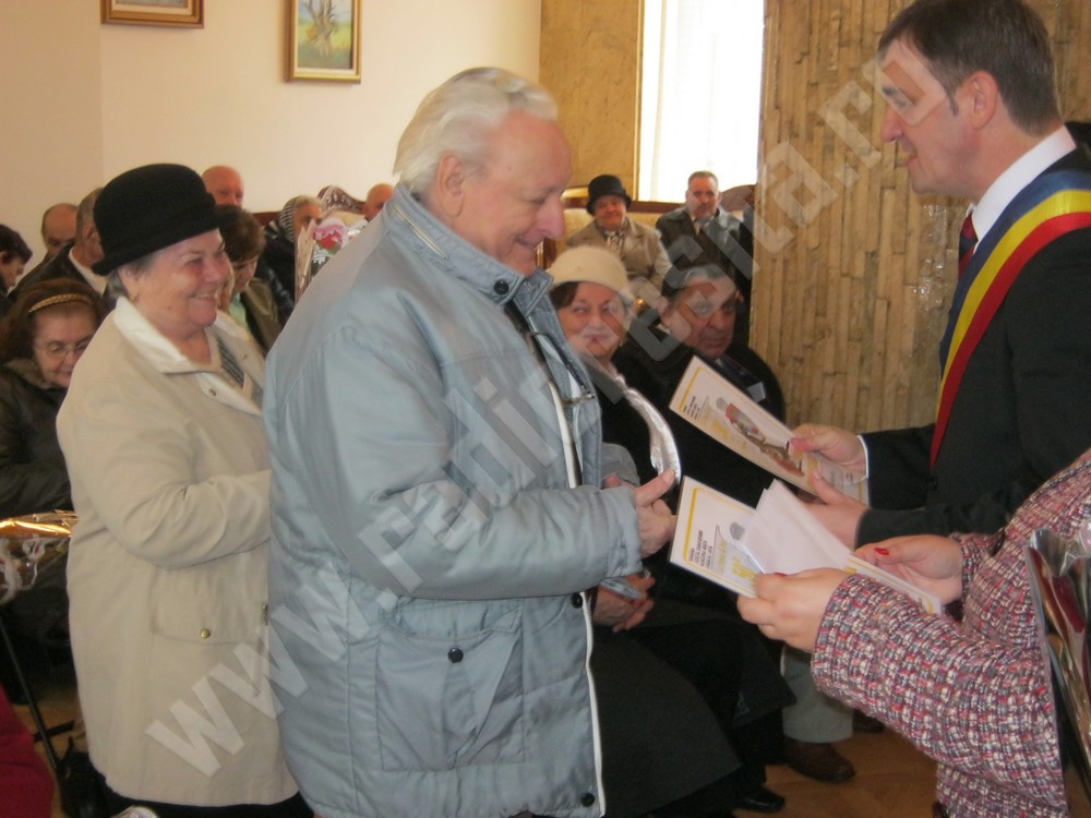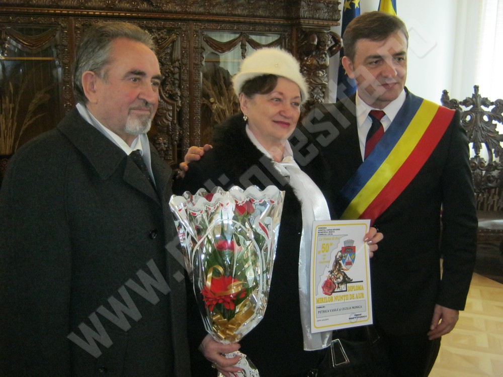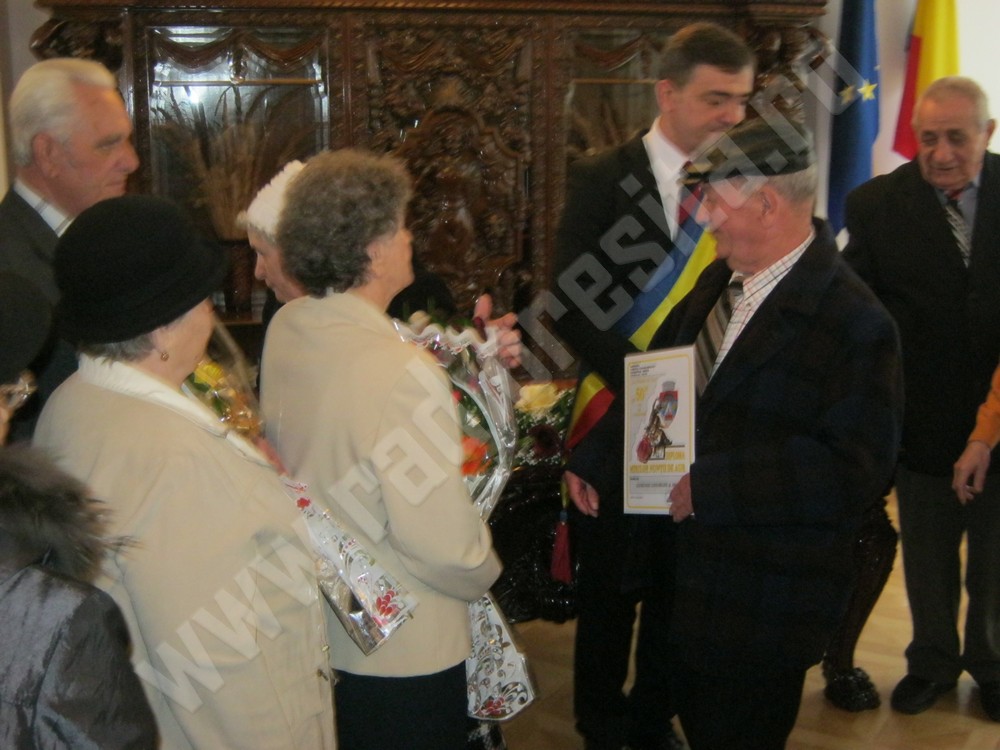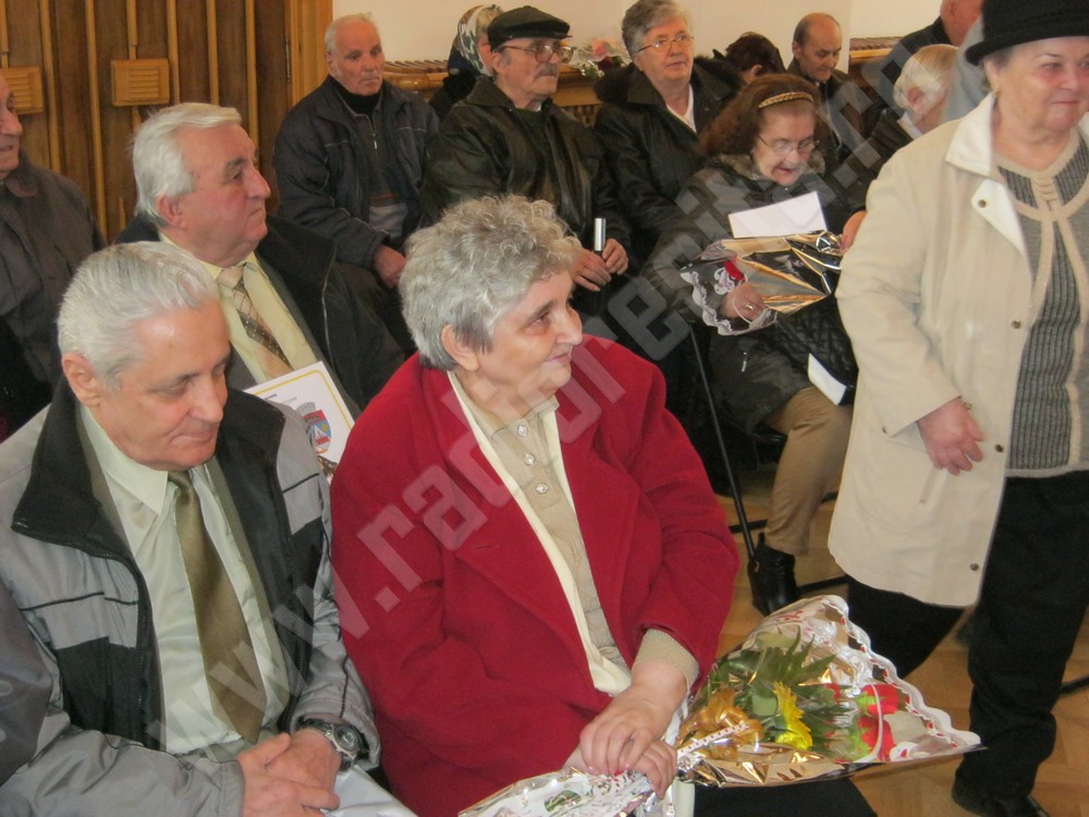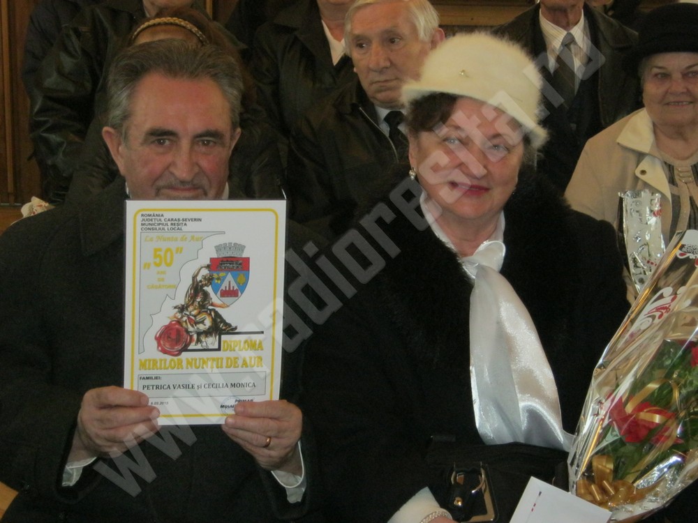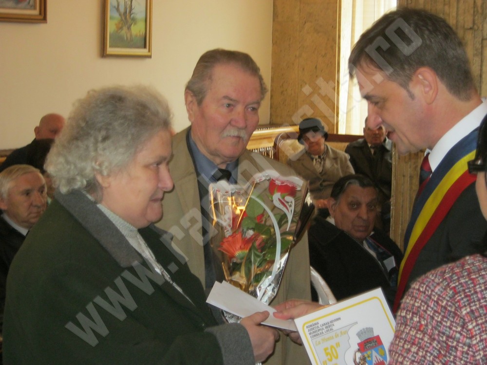 24 din cele 26 de cupluri, care au împlinit 50 de ani de căsătorie, au fost sărbătorite astăzi la Casa Municipală din Reşiţa. Primarul, Mihai Stepanescu, le-a înmânat acestora diplome de fidelitate, flori, felicitări de 8 martie, dar şi un cadou în bani, pentru anii petrecuţi împreună, la bine şi la greu. Fiecare cuplu a primit, cu această ocazie, 300 de lei. Partea oficială a fost urmată de închinarea unei cupe de şampanie, iar cuplurile aniversate au depănat amintiri din cele 5 decenii petrecuţi împreună. După cum au declarat majoritatea dintre acestea, ingredientul principal, pentru o căsnicie reuşită, este toleranţa, încrederea reciprocă, prietenia şi iubirea.