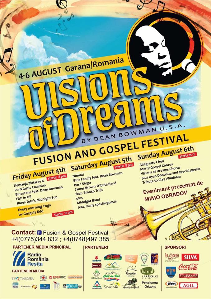 Prima editie a Festivalului de Fusion& Gospel -” Visions of Dreams” a debutat în această seară  pe scena din Poiana Lupului-Gărâna cu un program artistic absolut special. Acest eveniment de excepție produs artistic de Dean Bowman-un nume important al scenei de jazz, rock și avant-garde al New York-ului, provoacă cu recitaluri excepționale și inedite ce vor purta mintea și sufletul de la blues la jazz, funk, pop, rock si electronic.