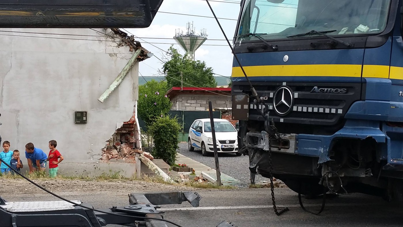 Din fericire, nimeni nu a fost răniţ însă atât camionul, cât şi casa au suferit pagube importante. TIR-ul a fost scos de pe trotuar abia câteva ore mai târziu, cu ajutorul unei macarale.