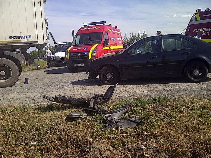 Traficul rutier s-a desfăşurat cu dificultate astăzi între localităţile Jebel şi Sag din cauza unui accident rutier în care a fost implicat un autoturism din Caraş-Severin. Este vorba de un Volkswagen, al cărui şofer a încercat să depăşească, într-o zonă interzisă, un tir. Nu a reuşit, întrucât autocamionul era angajat într-un viraj la stânga, aşa că l-a lovit din spate. În urma impactului, trei persoane au fost rănite, printre care şi un minor de 7 ani.