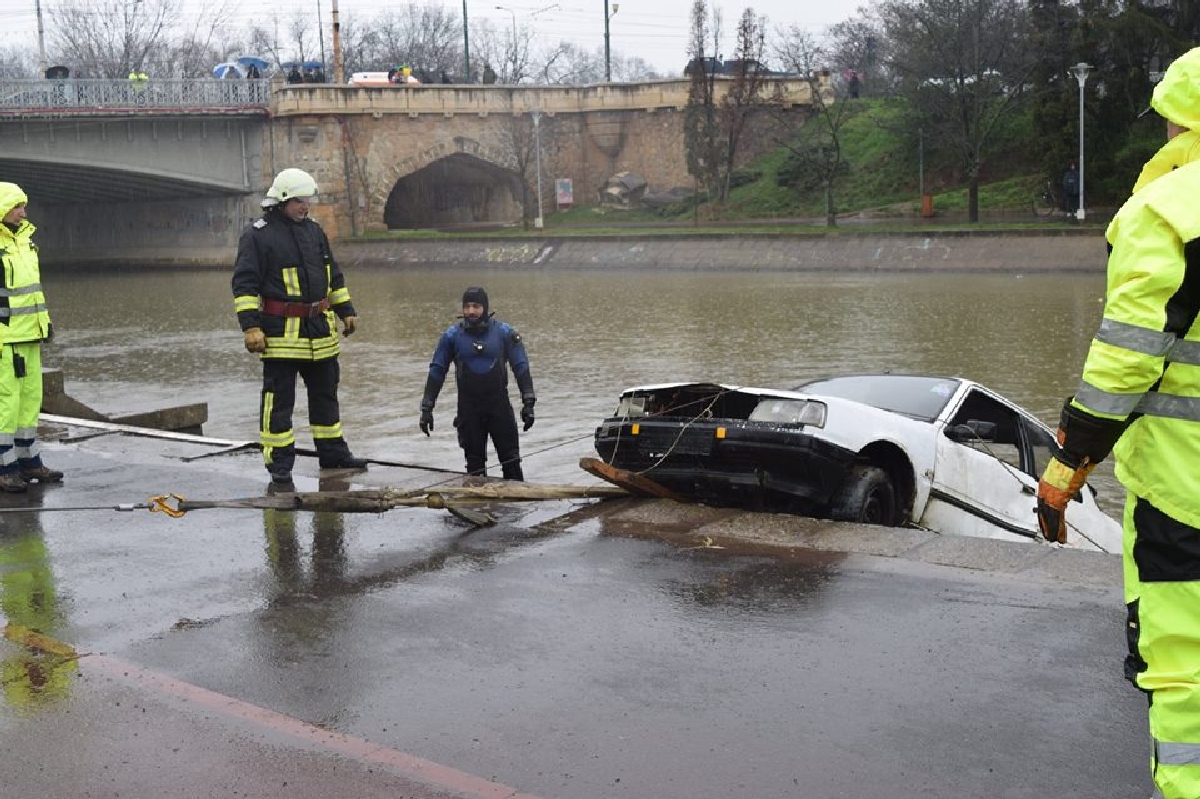 [FOTO] Accident rutier cu plonjare în Bega. Victima a fost salvată de scafandrii