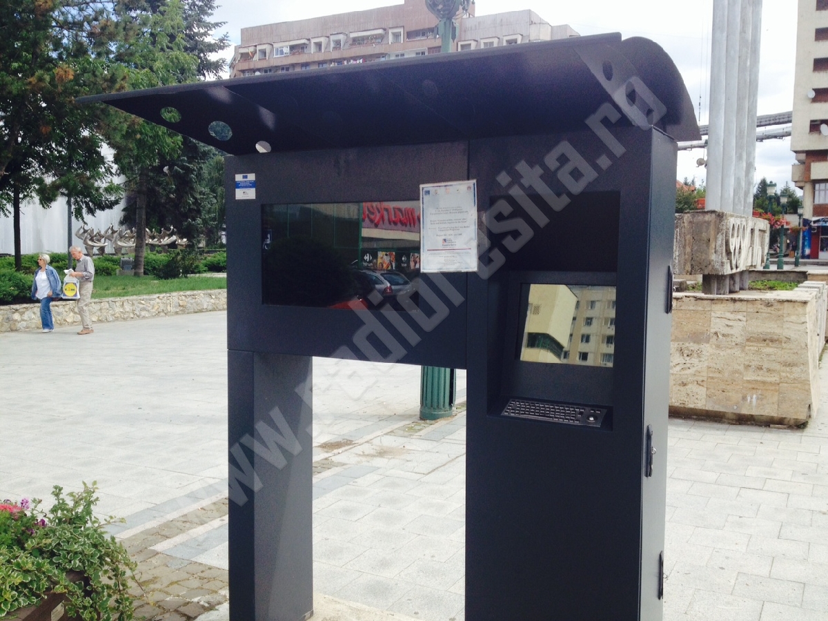 Achiziţionarea celor 20 de infochioşcuri s-a făcut în 2014 printr-un proiect transfrontalier cu municipalitatea din Kikinda. Valoarea investiţiei a fost de aproape 426 mii euro, din care 85% contribuția IPA, 13% — finanțarea Guvernului României, iar 2% a fost contribuția Consiliului Local Reșița.