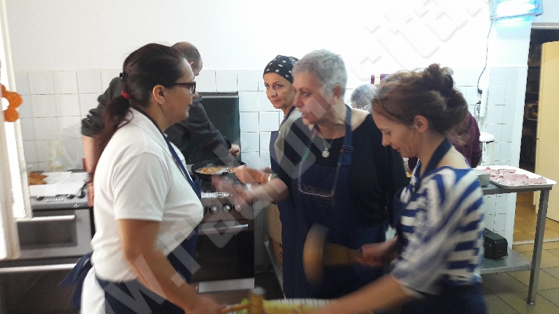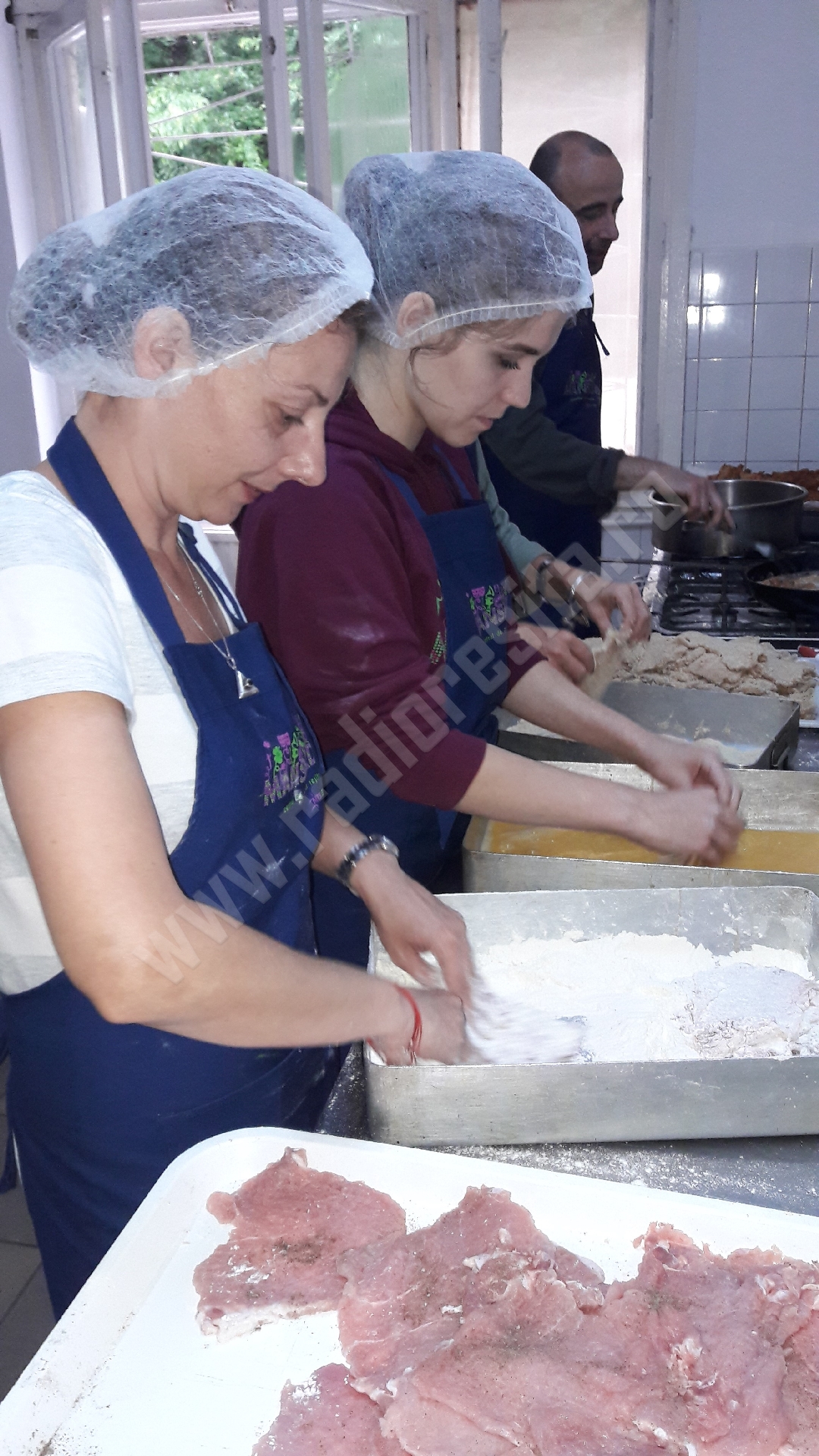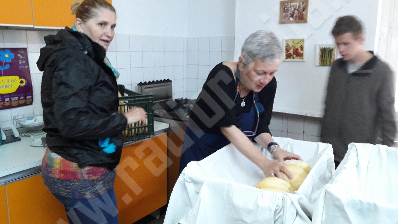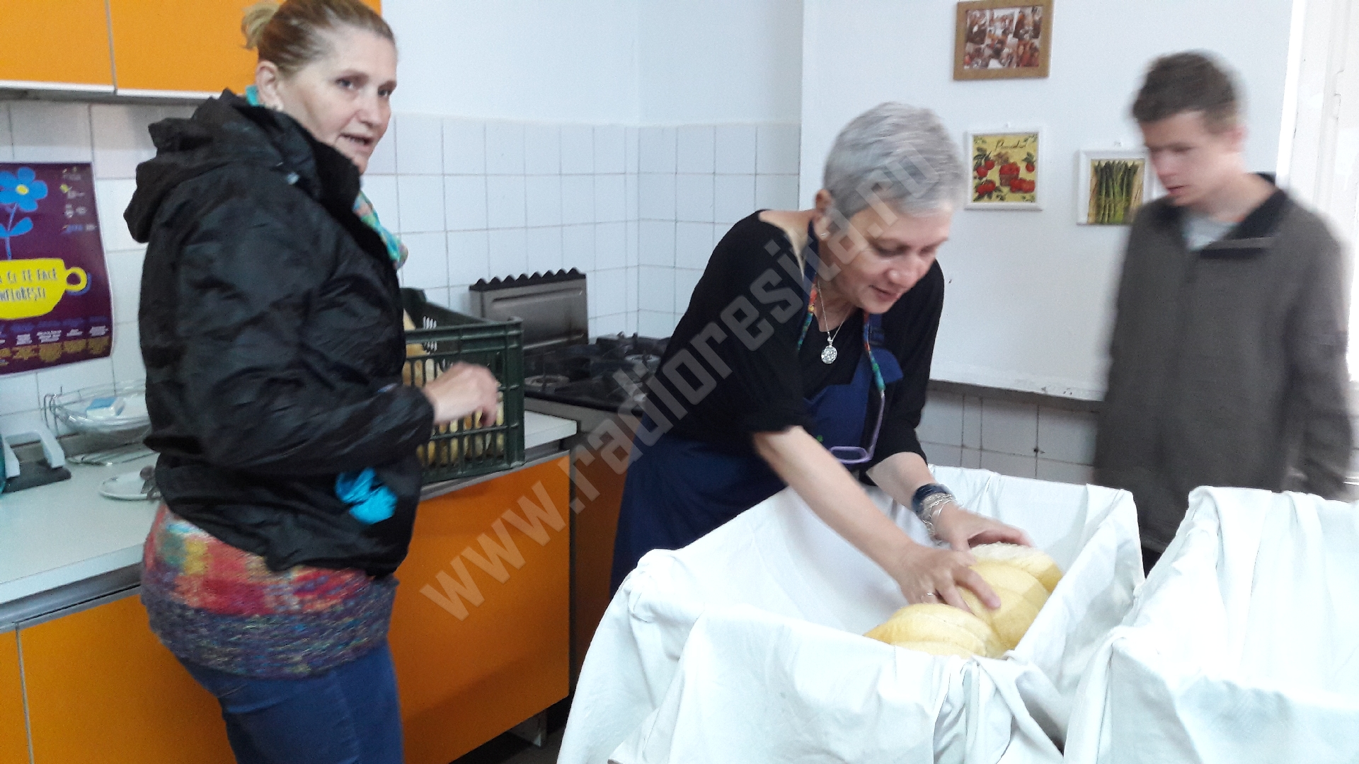 Voluntarii Centrului Mansarda împreună cu jurnaliştii pregătesc masa de prânz pentru copiii din Centrul de zi pe care Fundaţia Humanitas Pro Deo îl administrează.