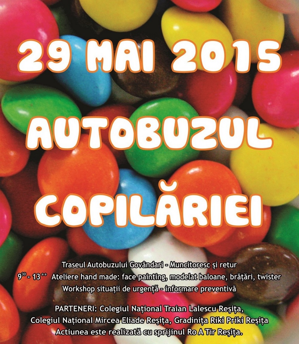 Autobuzul copilăriei circulă astăzi în municipiul Reșița, pentru a marca Ziua de 1 iunie. În autobuzul copilăriei, tinerii voluntari ai Centrului de Voluntariat Reşiţa vor face animaţie, vor organiza ateliere hand made mobile demonstrative: pictat pe față, modelat baloane, brăţări, magie. Tot în autobuz este rezervat un spațiu în care vor fi prezentate copiilor informații privind diversele situaţii de urgenţă, respectiv informare preventivă. Autobuzul va circula în intervalul orar 9.30- 13.00, pe traseul cartierul Lunca Bârzavei – Muncitoresc şi retur. Se vor afla în autobuz copii de la Colegiile Naționale: Traian Lalescu și Mircea Eliade și Grădinița cu Program Normal Riki Priki. Organizatori sunt: Direcţia Judeţeană pentru Sport şi Tineret Caraş –Severin, Centrul de Voluntariat Reşiţa, împreună cu Inspectoratul pentru Situații de Urgență Semenic Caraș Severin şi Ro A-Tir.
