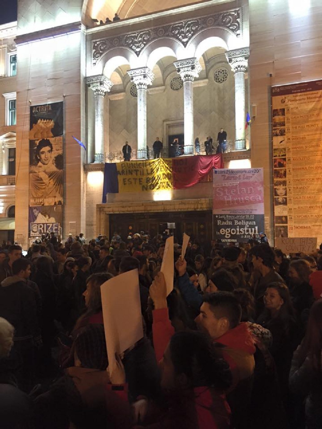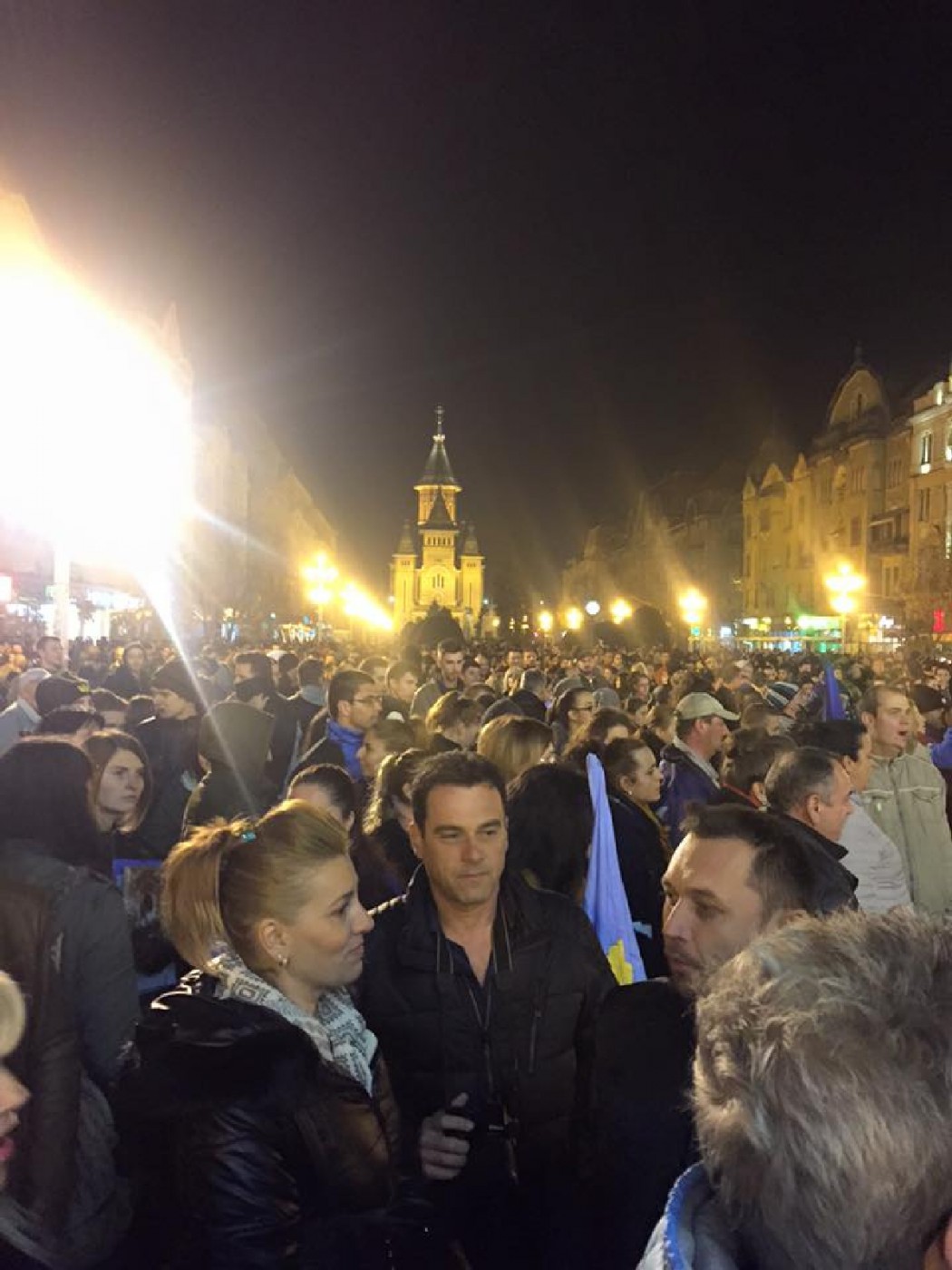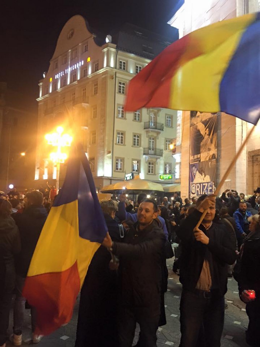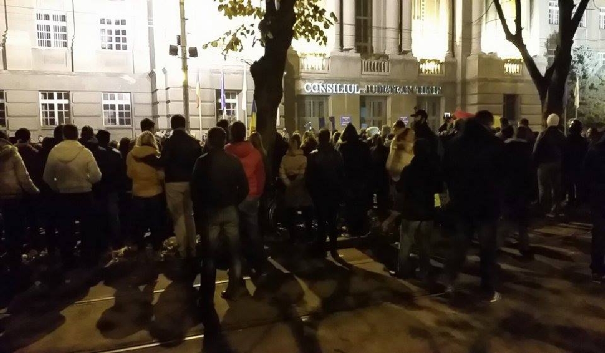„Bunicii la război, părinții la Revoluție, acum e rândul nostru”, acesta este mesajul transmis timişorenilor de la balconul Operei din Timișoara. În piață sunt aproximativ 4.000 de oameni, iar printre principalele scandări este “Jos corupția!”. De asemenea, protestatarii scandează „Nu mai vrem corupţie! Facem revoluţie” sau „Noi la datorie, voi la puşcărie”.