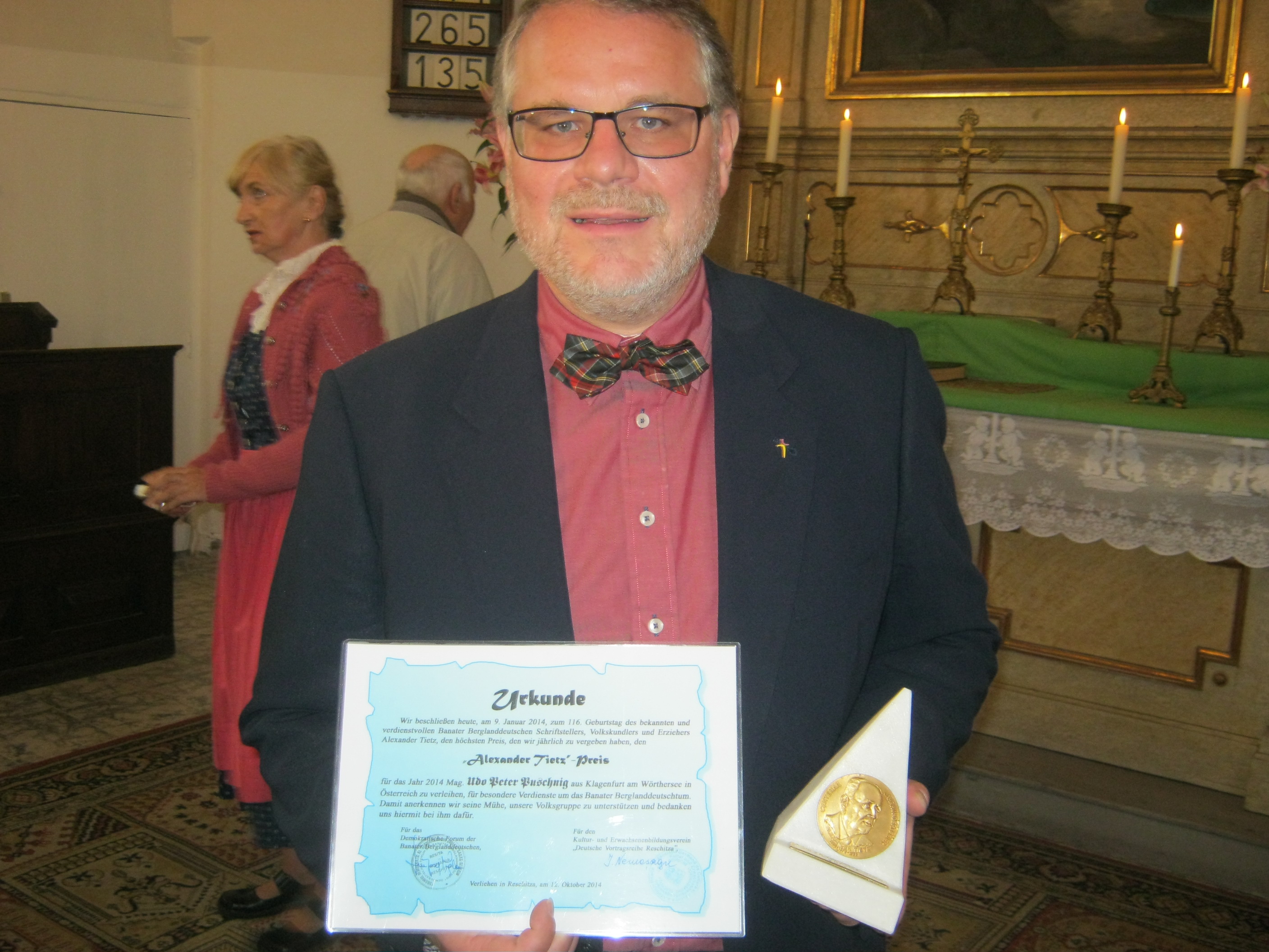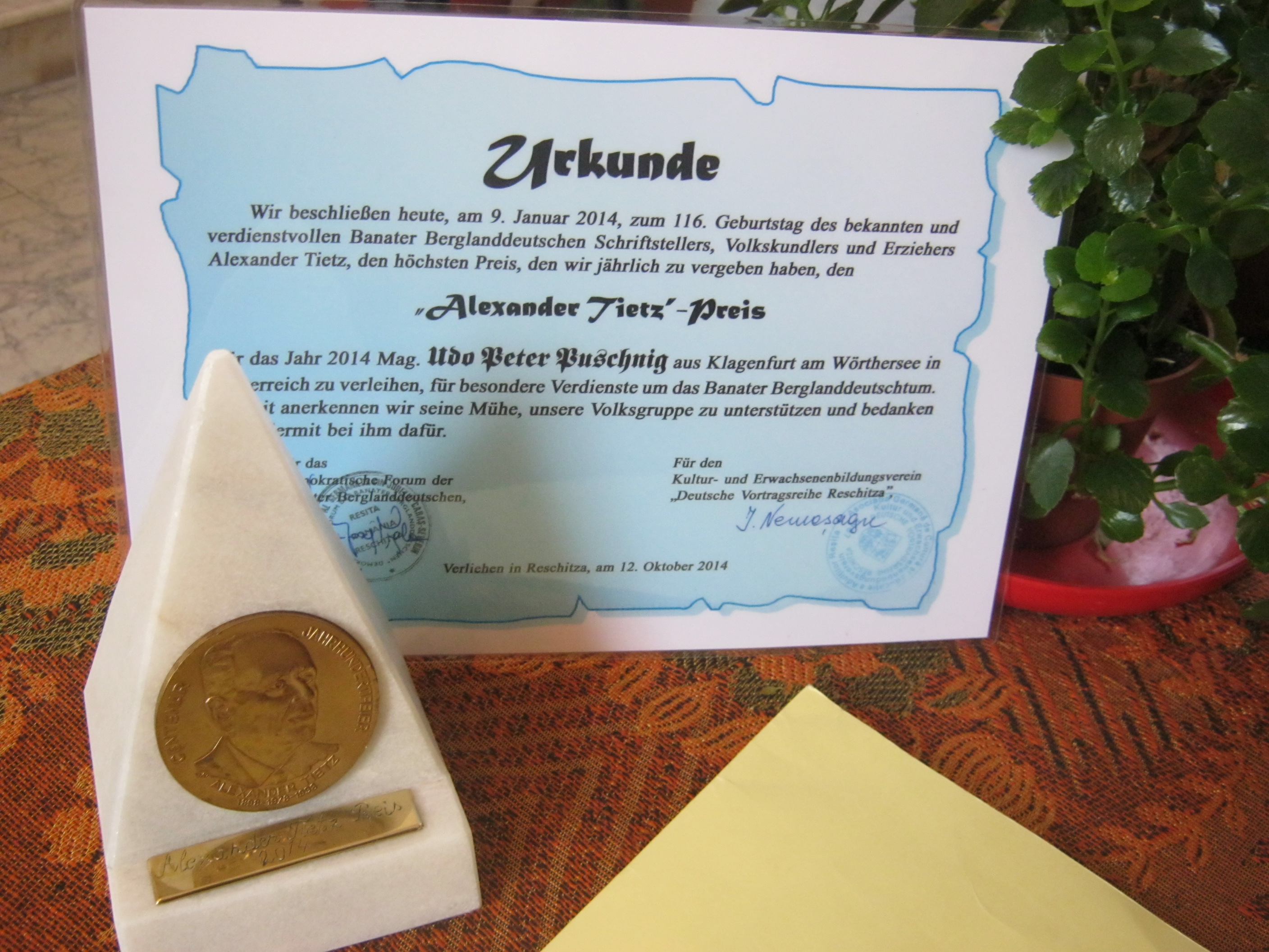 Cea mai înaltă distincţie a Asociaţiei germane de cultură şi educaţie a adulţilor Reşiţa, premiul “Alexander Tietz”, a fost decernată duminică, 12 octombrie omului de cultură şi prietenului etnicilor germani din Banatul de Munte, Udo Peter Puschnig din Klagenfurt, Carintia, Austria. Acesta este cel de-al 16-lea deţinător al acestui premiu, oferit de conducerea forului etnicilor germani din urbea de pe Bârzava, persoanelor care îşi aduc aportul, ani de-a rândul, la conservarea şi promovarea identităţii germane. Evenimentul s-a consumat în mijlocul comunităţii evanghelice din municipiul Reşiţa şi a constituit şi închiderea celei de-a XXIV-a ediţii a Decadei Culturii Germane în Banatul montan, desfăşurată în mai multe localităţi din judeţele Caraş-Severin, Mehedinţi şi Timiş în perioada 3 – 12 octombrie.