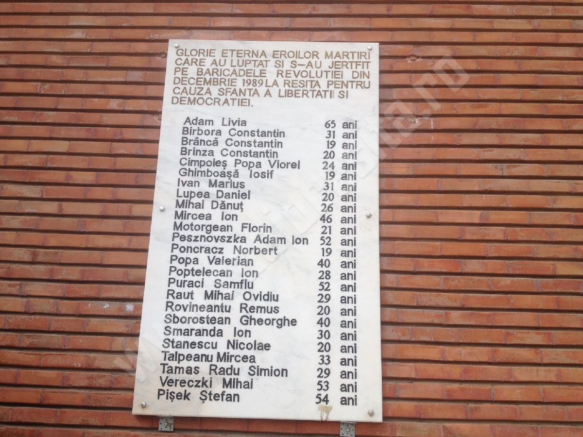 Asta stă scris pe placa comemorativă amplasată pe clădirea Primăriei din centrul civic. În faţa troiţei s-au adunat astăzi, membrii familiilor celor căzuţi, asociaţiile de revoluţionari, reprezentanţi ai Prefecturii, Consiliului Judeţean, ai structurilor MAI, ai formaţiunilor politice, dar şi cetăţeni care au adus un omagiu reşiţenilor care au murit în Revoluţie. A fost oficiată o slujbă de pomenire de către protopopul Gheorghe Şuveţi, s-a ţinut un moment de reculegere şi s-a făcut apel la unitate. Revoluţionarii au solicitat reabilitarea troiţei aflată în stare de degradare şi în discursurile lor şi-au exprimat dorinţa ca autorităţile locale să facă mai multe eforturi pentru ca lupta dusă împotriva regimului de acum 28 de ani să nu fi fost în zadar. În final au fost depuse coroane de flori la troița ridicată în cinstea eroilor.