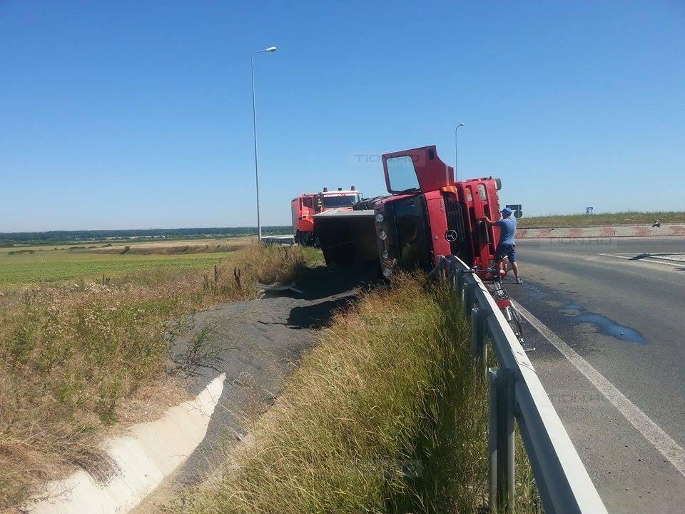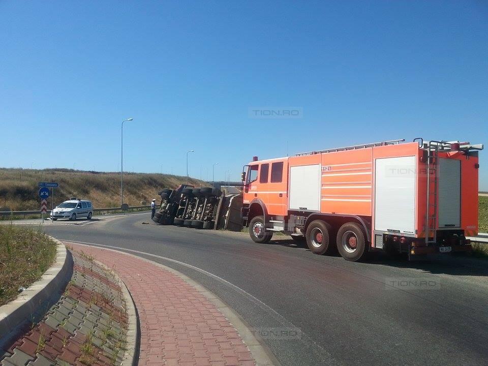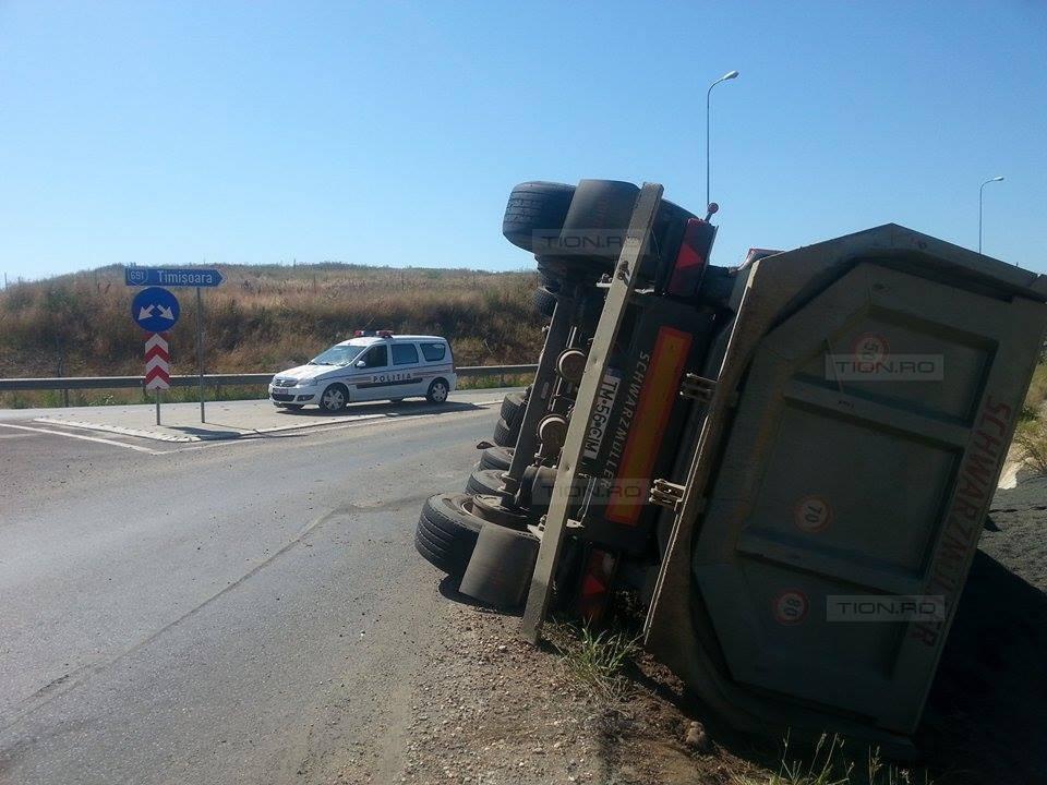 Un camion încărcat cu pietriş s-a răsturnat, sâmbătă dimineaţa, în sensul giratoriu de la urcarea pe autostrada Timişoara-Arad. Şoferul susţine că a pierdut controlul camionului, după ce încărcătura a intrat în balans.