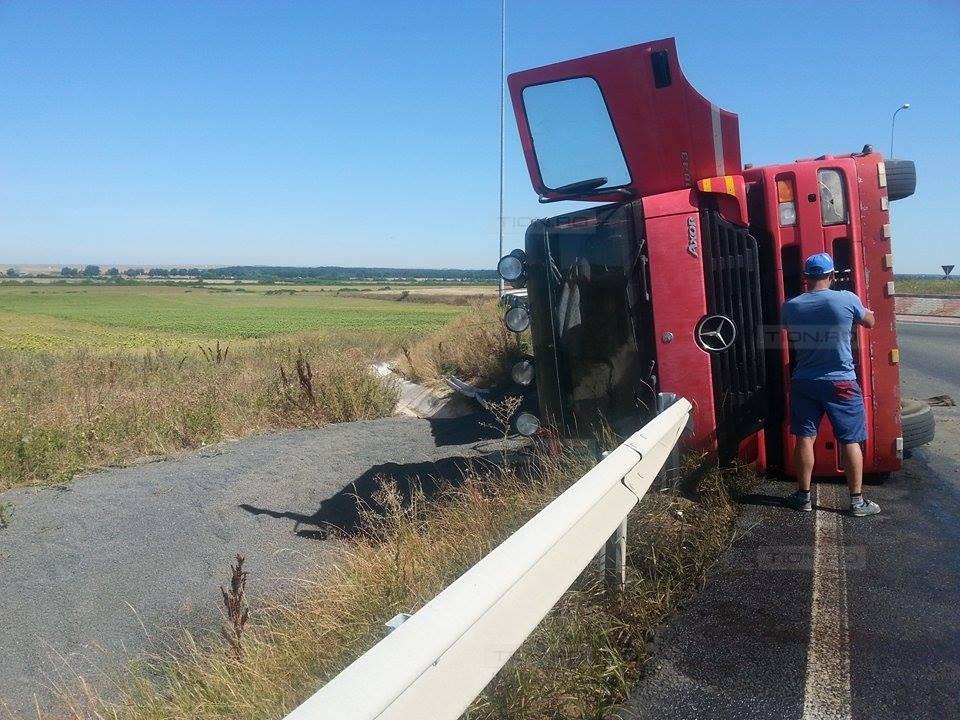 Din primele informaţii obţinute la faţa locului, şoferul camionului se îndrepta către Timişoara. În sensul giratoriu de la urcarea pe autostrada Timişoara-Arad, acesta a pierdut controlul volanului şi s-a răsturnat pe marginea drumului. Doar o minune a făcut ca autovehiculul de mare tonaj să nu se prăbuşească în şanţul adânc de câţiva metri de pe marginea drumului. Şoferul a scăpat nevătămat, însă întreaga încărcătură s-a răsturnat în afara părţii carosabile.