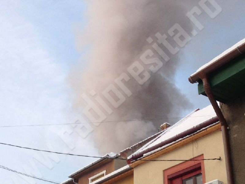 EXCLUSIV [FOTO] Incendiu la Reşiţa: Arde un atelier de tâmplărie şi există pericolul ca flăcările să se extindă