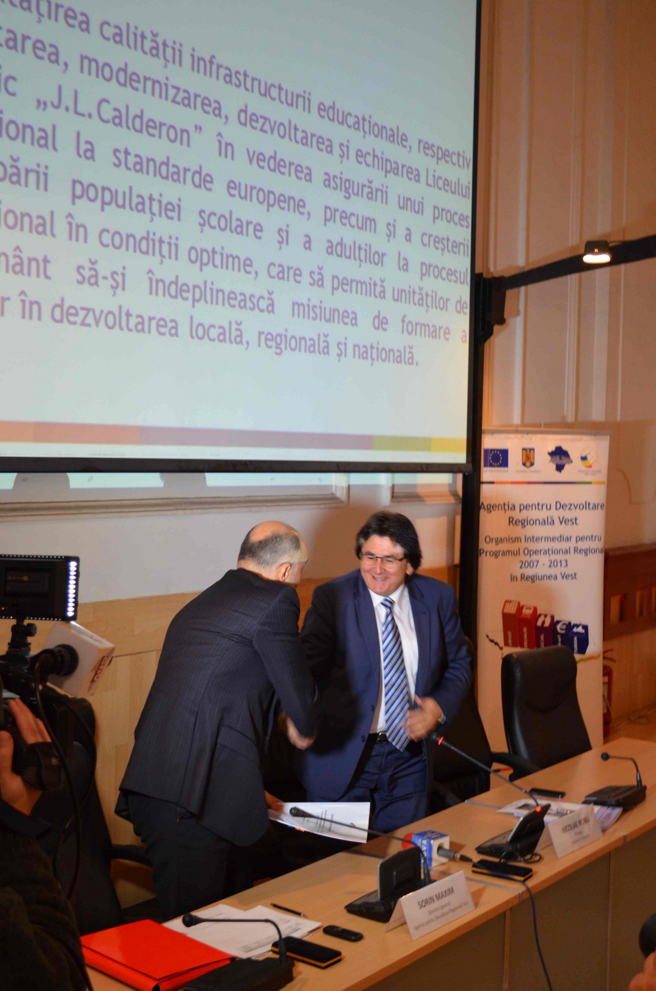 Contractul de finanţare pentru proiectul Reabilitarea, modernizarea, dezvoltarea şi echiparea infrastructurii educaţionale a Liceului Teoretic Jean Louis Calderon din Timişoara, a fost semnat astăzi de primarul municipiului Nicolae Robu şi directorul general al Agenţiei pentru Dezvoltare Regională Vest, Sorin Maxim.
