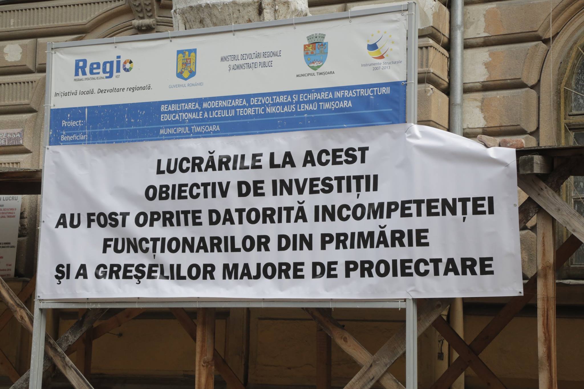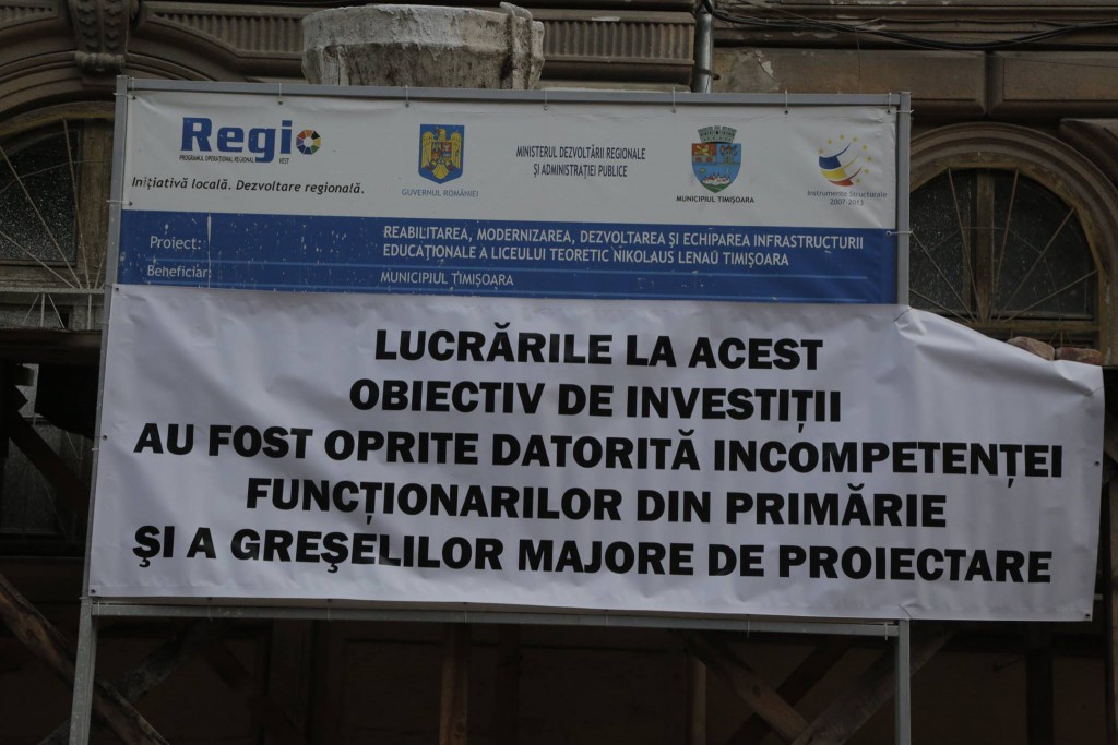 Lucrările de reabilitare a Liceului Lenau din Timișoara au fost sistate. Constructorul a montat un banner pe clădirea unităţii, pe care menţionează că investiţia a fost oprită din cauza incompetenţei unor angajaţi ai Primăriei dar şi din cauza unor greşeli de proiectare.