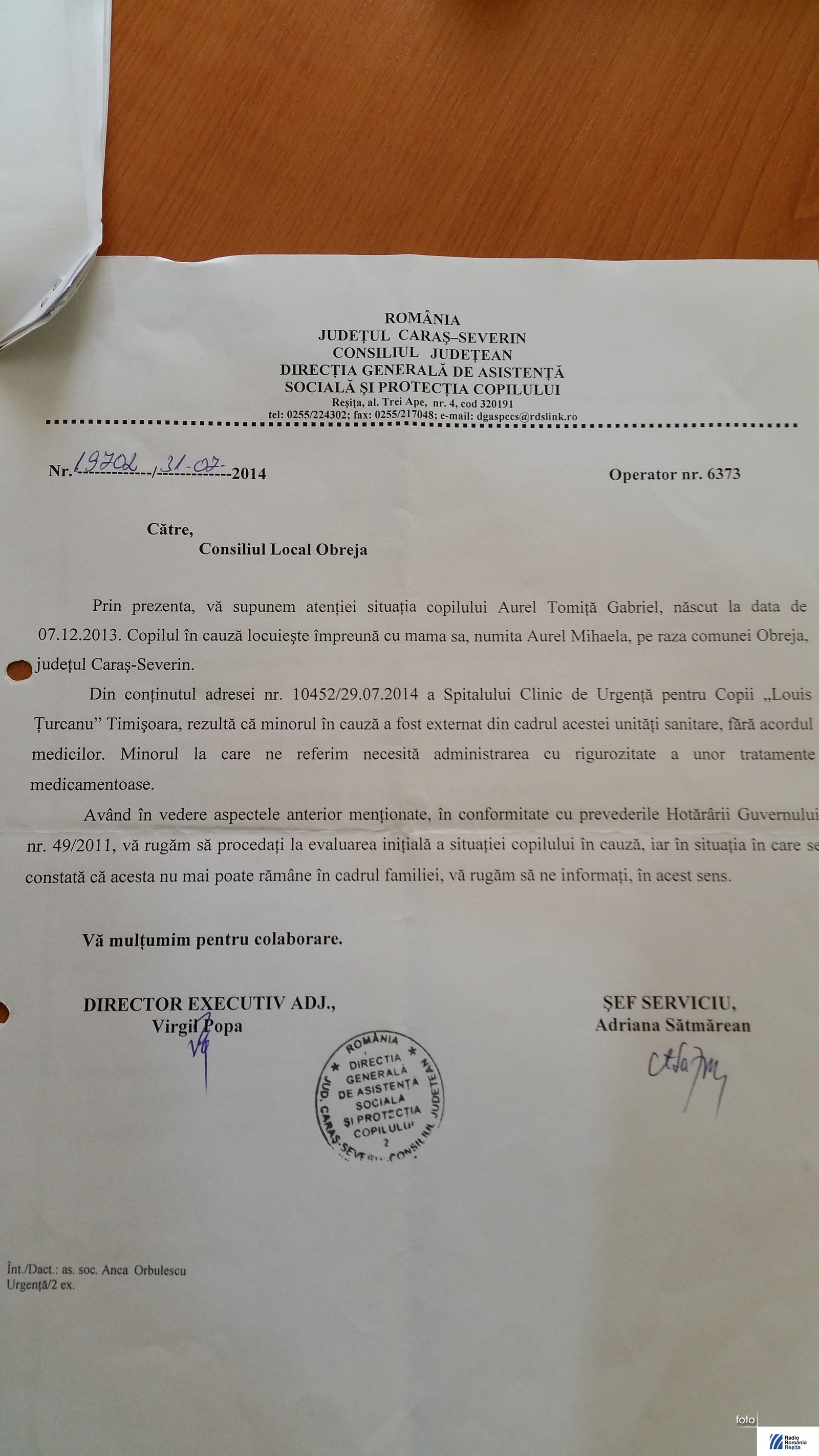 O familie din Obreja acuză medicii pediatri de la Spitalul Județean Reșița, de neglijență în serviciu. Tatăl bebelușului spune că pe fișa de externare scrie clinic sănătos, însă a doua zi după ce l-a luat din spital, băiețelul de doar 9 luni a decedat în brațele sale. Familia s-a aflat în atenția asistenților sociali încă de la nașterea bebelușului, după ce mama a decis să-și ia copilul din Spitalul Luis Țurcanu din Timișoara, spune asistentul social Mihai Gugea, din cadrul Primăriei Obreja. Tatăl băiatului ne-a declarat că era conștient de boala cu care s-a născut băiețelul, Sindrom Down, malformaţii cardiace şi tetrapareză spastică, însă medicii nu și-au dat tot interesul să-l trateze corespunzător, fiind purtat dintr-un spital în altul. Medicii legiști au constatat că moartea bebelușului a survenit de la o insuficiență cardio respiratorie acută. Părinții copilului nu sunt hotărâți dacă vor depune plângere împotriva Spitalului Județean Reșița, însă Poliția Obreja a deschis o anchetă în acest caz. Rudele micuțului se pregătesc de înmormântare, care este programată pentru sâmbătă, 27 septembrie la ora prânzului.