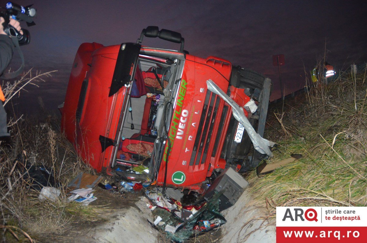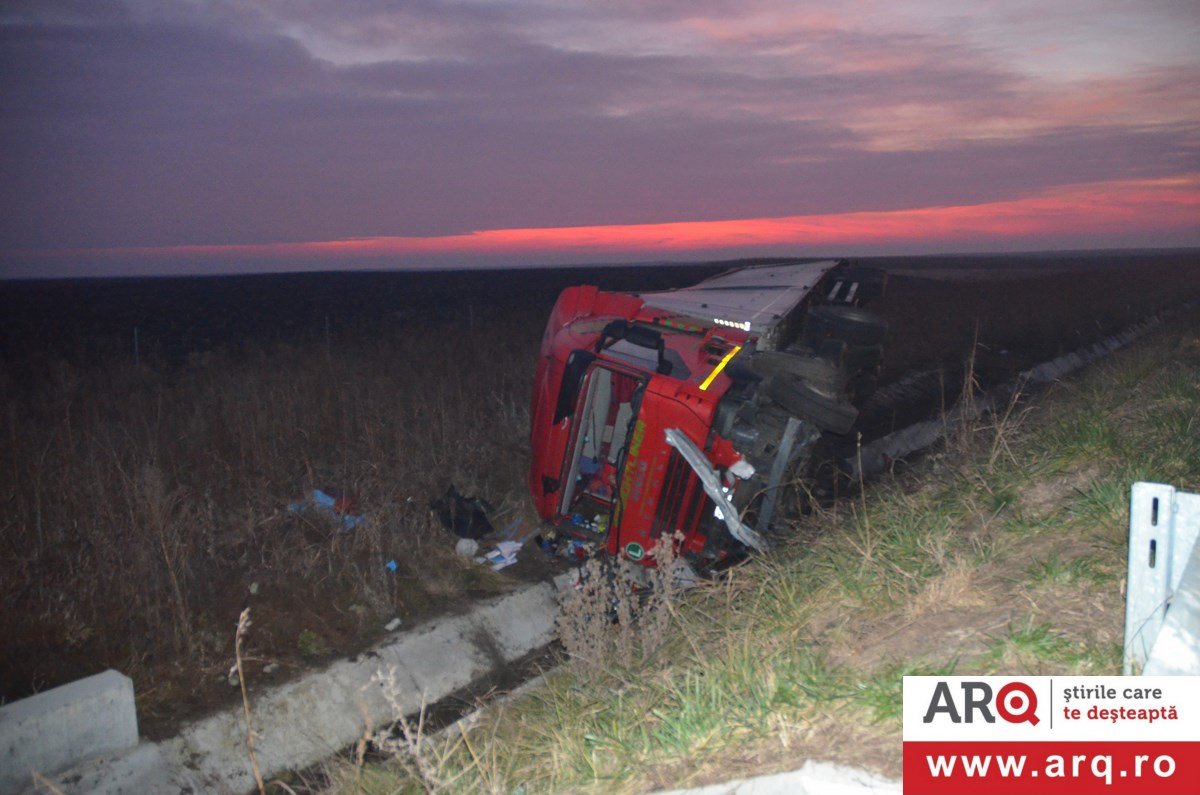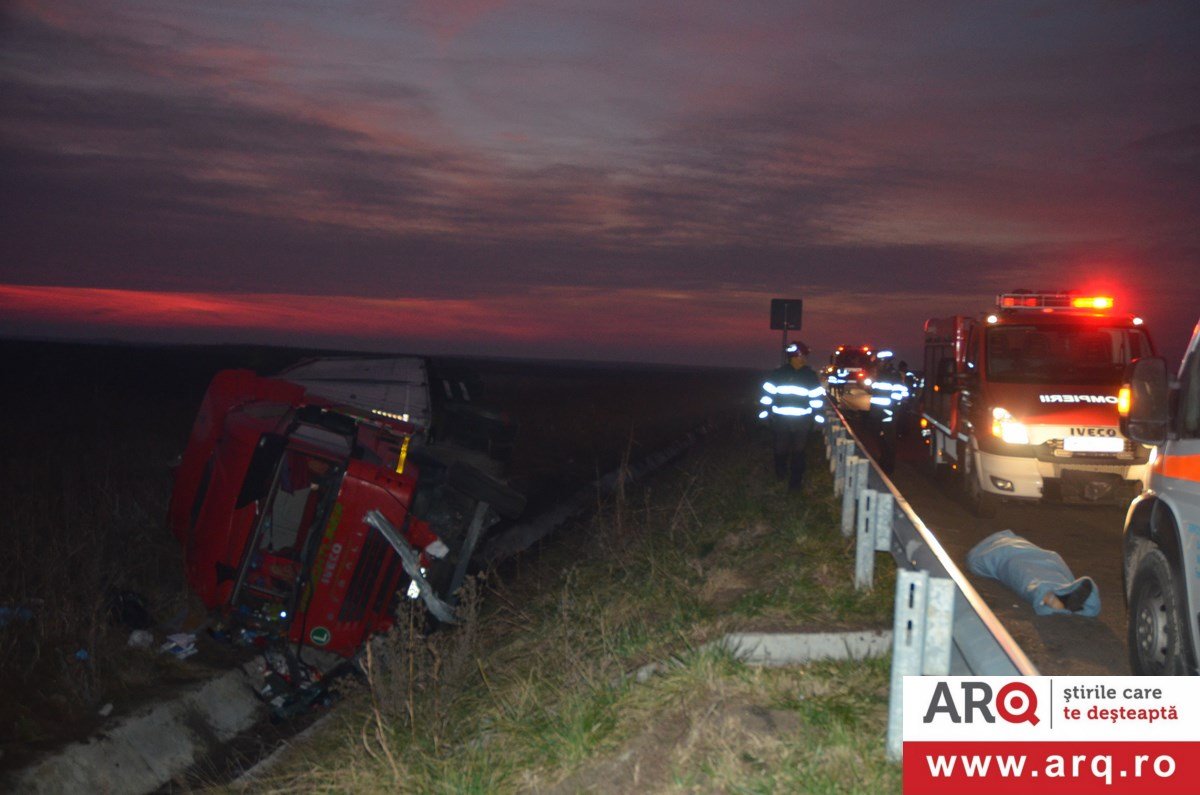 Accidentul a avut loc în apropiere de Pecica. TIR-ul circula pe autostradă pe sensul de mers Nădlac spre Arad. Din motive încă neelucidate a pierdut controlul TIR-ului şi s-a răsturnat în şanţul din dreapta autobenzii pe direcţia de mers. În urma impactului şoferul, un bărbat în vârstă de 43 de ani, a decedat pe loc. Un echipaj de descarcerare din cadrul Detaşamentului Arad s-a deplasat la faţa locului pentru a-l scoate dintre fiarele contorsionate ale cabinei. Şoferul TIR-ului se afla singur în cabină în momentul producerii accidentului. Poliţiştii efectuează cercetări pentru a stabili cauzele producerii accidentului.