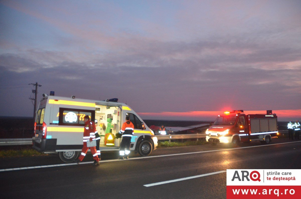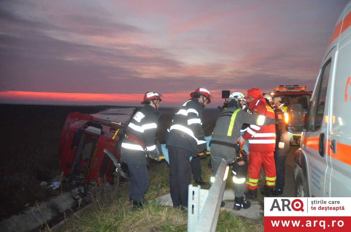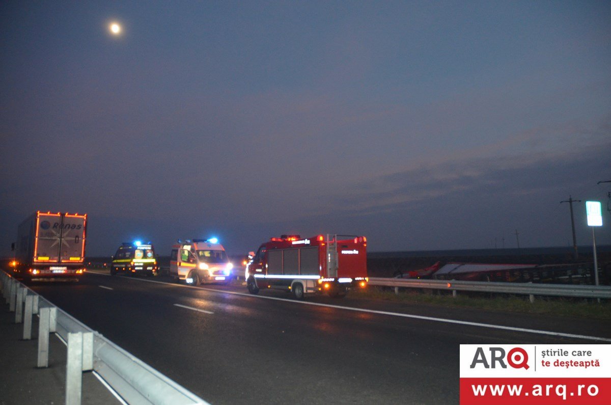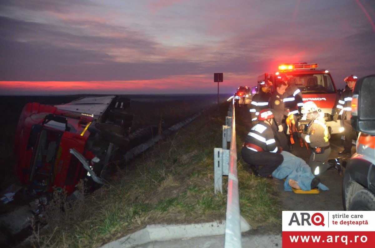 Accidentul a avut loc în apropiere de Pecica. TIR-ul circula pe autostradă pe sensul de mers Nădlac spre Arad. Din motive încă neelucidate a pierdut controlul TIR-ului şi s-a răsturnat în şanţul din dreapta autobenzii pe direcţia de mers. În urma impactului şoferul, un bărbat în vârstă de 43 de ani, a decedat pe loc. Un echipaj de descarcerare din cadrul Detaşamentului Arad s-a deplasat la faţa locului pentru a-l scoate dintre fiarele contorsionate ale cabinei. Şoferul TIR-ului se afla singur în cabină în momentul producerii accidentului. Poliţiştii efectuează cercetări pentru a stabili cauzele producerii accidentului.