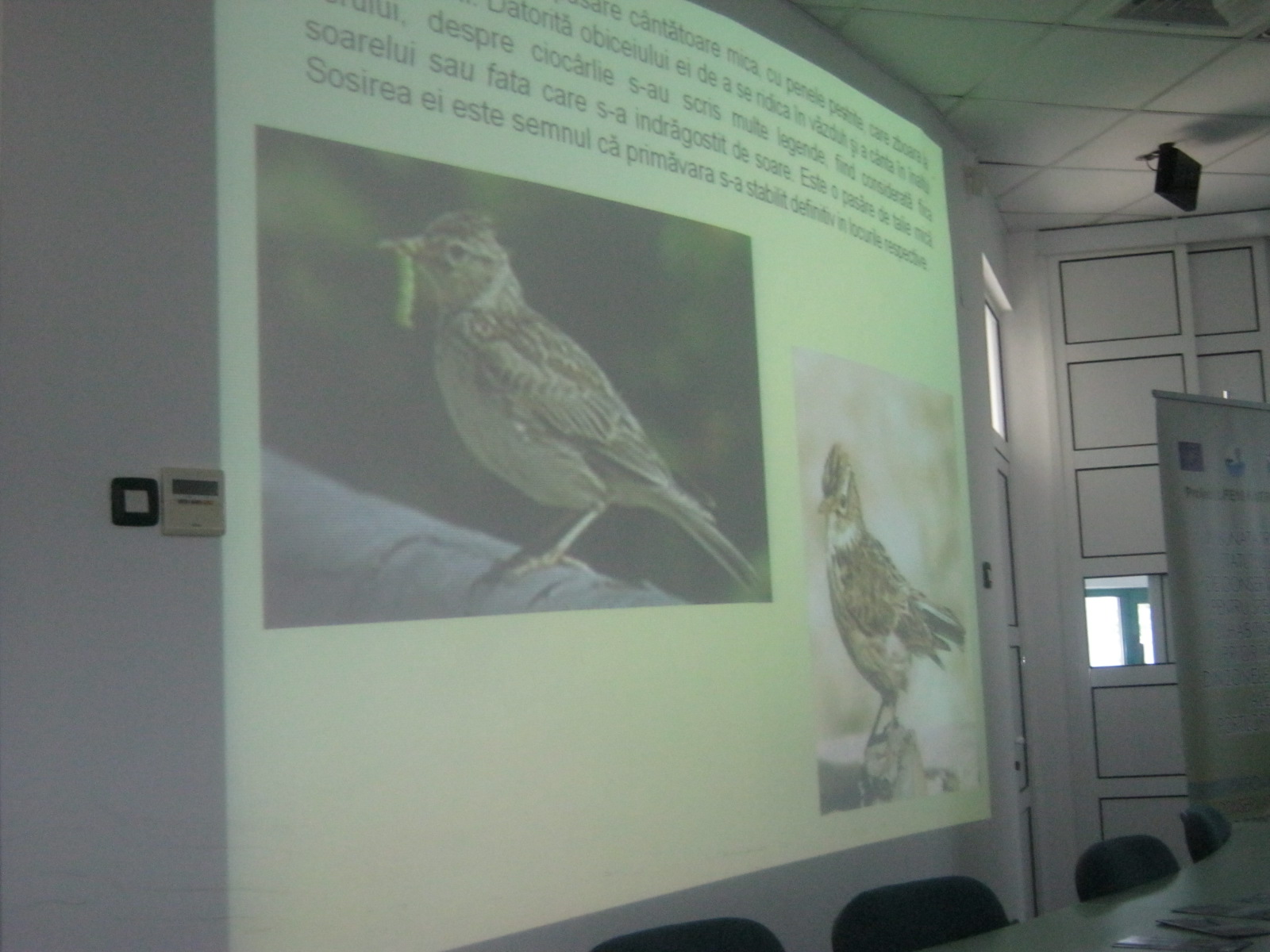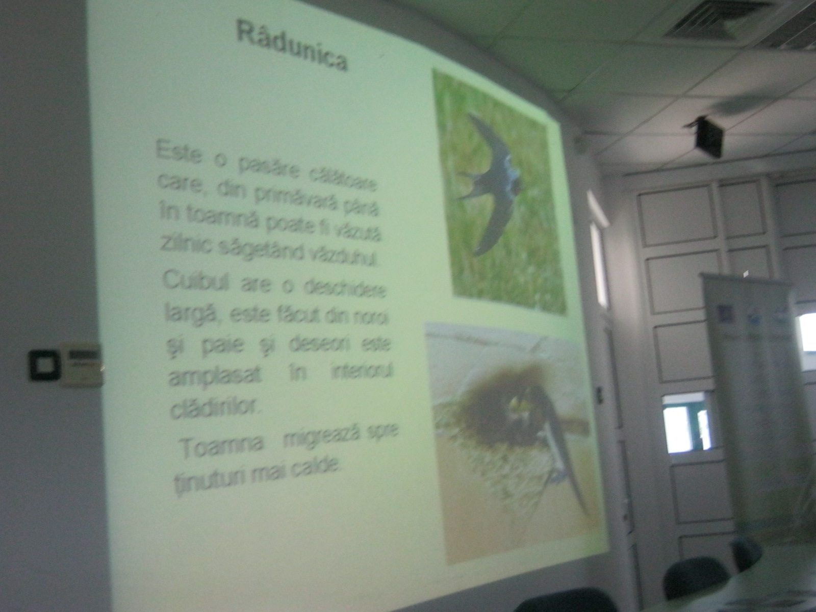 Consilier în cadrul APM Reşiţa, Mirela Ianoşi a vorbit asistenţei despre cele 400 de specii migratoare din România, precum: cucul, berzele, potârnichea, privighetoarea, ciocârlia, pupăza, rândunica, lebăda de vară, cocorul, corcodelul mare, ţigănuşul şi multe altele şi speciile migratoare sau parţial migratoare găzduite de cele 7 arii de protecţie avifaunistică declarate în urma încheierii de înţelegeri transfrontaliere, cormoranul mic, raţa roşie, egretele, heretele de stuf etc.