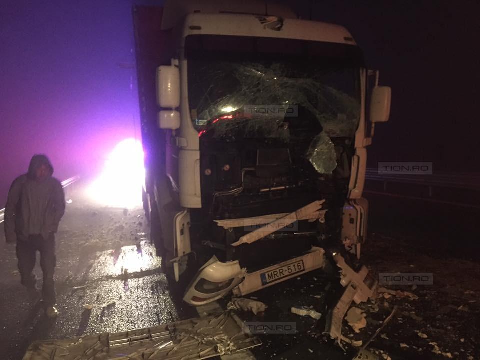 După impact, autotrenul șoferiței, care era încărcat cu varză, a fost lovit de alte două autotrenuri, care de asemenea nu l-au observat din cauza ceții dense. În urma accidentului, șoferița a fost rănită și a primit îngrijiri medicale la fața locului, iar marfa din autotrenuri s-a împrăștiat pe autostradă, îngreunând circulația pe sensul de mers către Timișoara, pe o lungime de aproximativ 300 de metri. Șoferul autotrenului încărcat cu lemne, singurul de naționalitate română implicat în accident, a declarat pentru Tion.ro că a auzit o bufnitură din spate și inițial a crezut că i-a explodat o roată. Abia după ce a tras pe dreapta, pe banda de urgență, și-a dat seama că a fost lovit. A mai apucat doar să vadă cum autotrenul șoferiței a fost lovit de alte două vehicule de mare tonaj. Unul dintre acestea era încărcat cu pufarine. Polițiștii continuă cercetările pentru a stabili cu exactitate condițiile în care s-a produs accidentul.