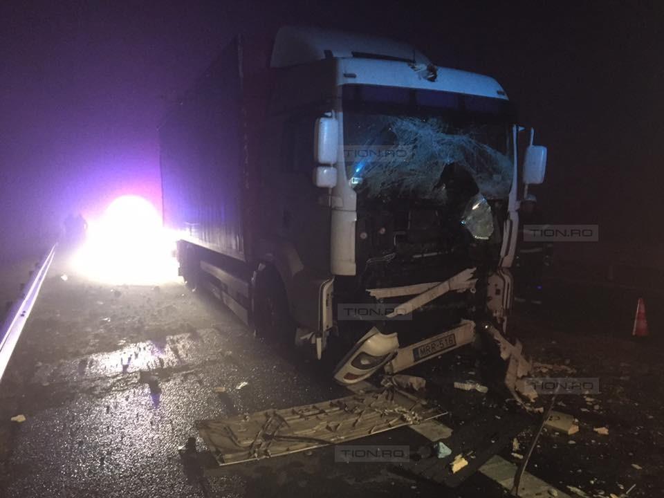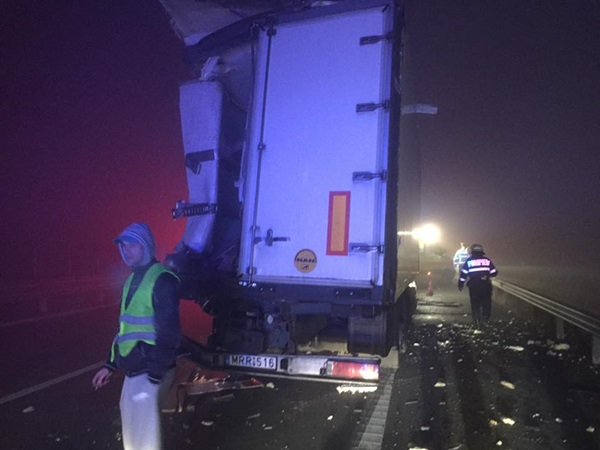 [FOTO] Patru autotrenuri implicate într-un accident în lanț pe autostrada Timișoara – Arad
