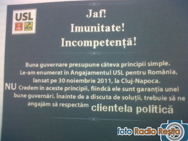 În document se precizează, printre altele: „Venirea la guvernare pe 7 mai 2012 a fost momentul din care USL şi-a dat arama pe faţă – şi-a dorit puterea pentru a-şi duce adevăratul program de guvernare la bun sfârşit. Obiectivele adevărate ale USL au fost tot timpul jefuirea României şi românilor şi folosirea banilor pentru umplerea buzunarelor USL şi ale clienţilor politici, tratarea cu incompetenţă criminală a problemelor legate de guvernare şi asigurarea spatelui aleşilor USL în justiţie. Victimele USL sunt România şi românii. În 22 de luni nu s-a reformat nimic, nu s-a început niciun proiect, nu s-a venit cu nicio viziune legată de dezvoltarea României”. (Sebastian Dragomir)