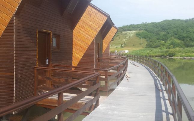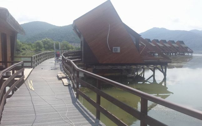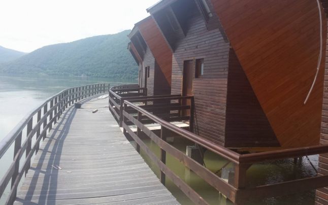 Au fost construite 15 bungalouri din lemn, pe piloni, care sunt dotate un living, chicineta, baie, în partea de jos, plus dormitorul aflat la etaj. Toate căsuţele plutitoare au şi o terasă cu vedere spre malul sârbesc, unde oamenii pot face plajă, pot să pescuiască sau să se relaxeze. “Există şi un ştrand amenajat, un loc de parcare pentru 40 de maşini. Este doar prima parte a proiectului: 15 bungalouri, ştrandul şi recepţia. Vom avea şi un restaurant care va fi gata anul viitor. Vor mai fi încă 15 bungalouri în oglindă, dar aşteptăm să vină un investitor care să dorească să construiască aici”, a mai spus Liubimirescu. S-au stabilit deja şi preţurile pentru cei care vor să doarmă deasupra Dunării: 250 de lei pentru o noapte într-o căsuţă plutitoare.