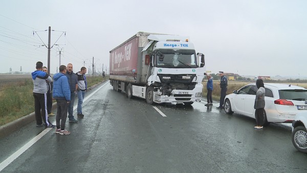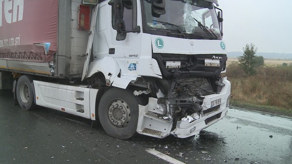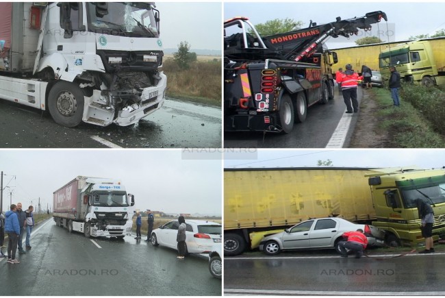 Ploaia măruntă care a căzut peste Arad a pus probleme în traficul de pe şoselele judeţului. La Vladimirescu traficul rutier a fost blocat în urma unui accident în care au fost implicate două TIR-uri. Potrivit reprezentanţilor IPJ Arad, cele două autotrenuri – unul condus de un cetăţean turc, iar celălalt de către un timişorean – mergeau în aceeaşi direcţie de mers, unul în spatele celuilalt. TIR-ul care mergea în spatele celuilalt nu a păstrat o distanţă corespunzătoare în mers faţă de cel din faţă intrând în acesta. Tamponarea nu s-a soldat cu victime.