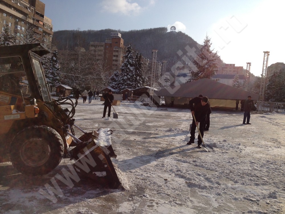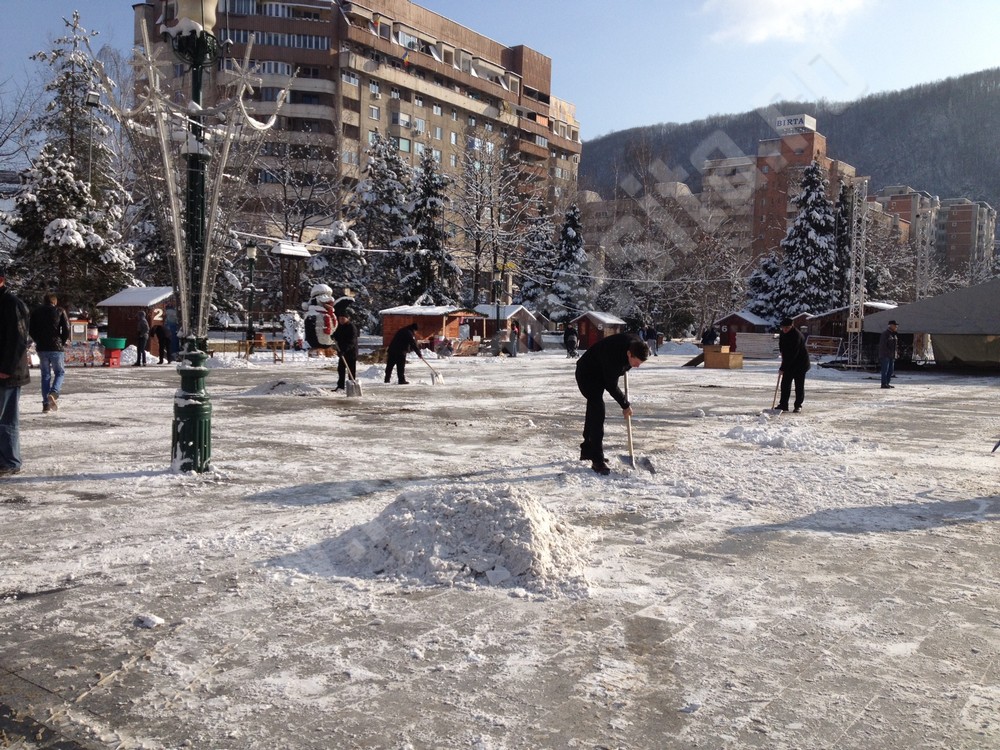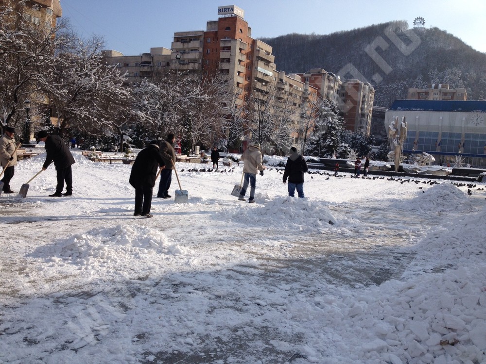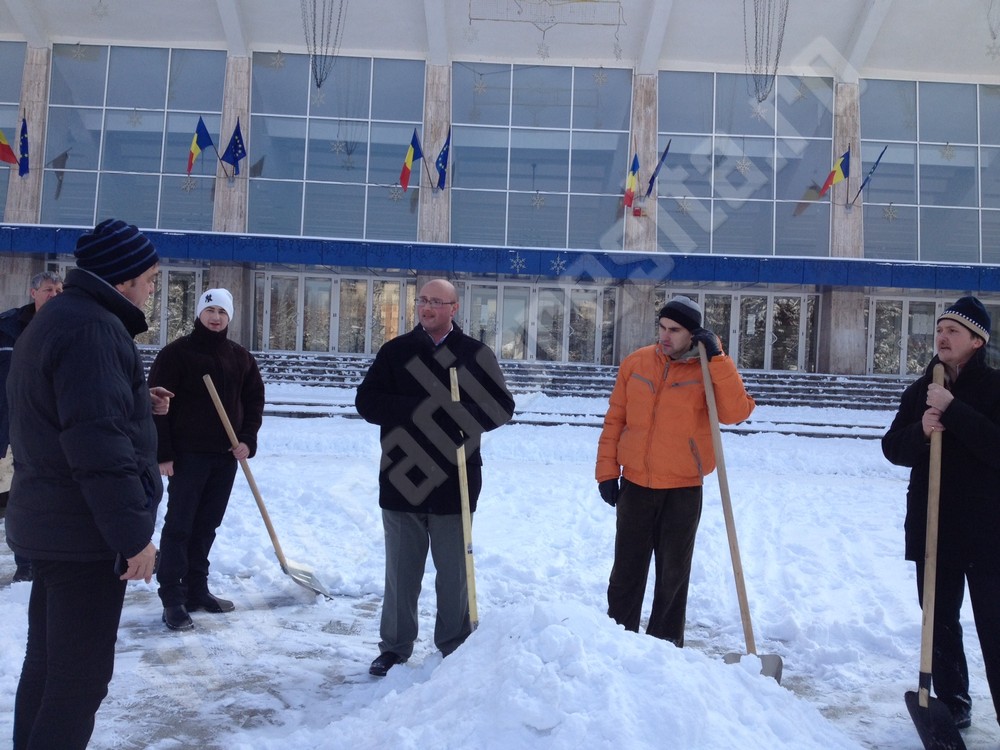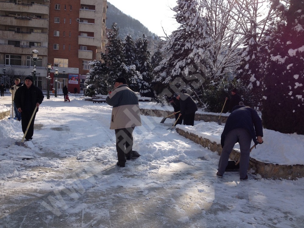 Angajaţii Primăriei Reşiţa au participat astăzi la o acţiune în premieră: au curăţat zăpada din centrul Civic. Deoarece singur serviciu de specialitate nu făcea faţă la volumul mare de muncă, în această dimineaţă 59 de bărbaţi, între care secretarul instituţiei şi directori de servicii, ajutaţi de utilaje de preluare şi încărcare a zăpezii, au degajat tot centrul municipiului, după care s-au mutat în Parcul Tricolorului, unde au curăţat căile de acces.