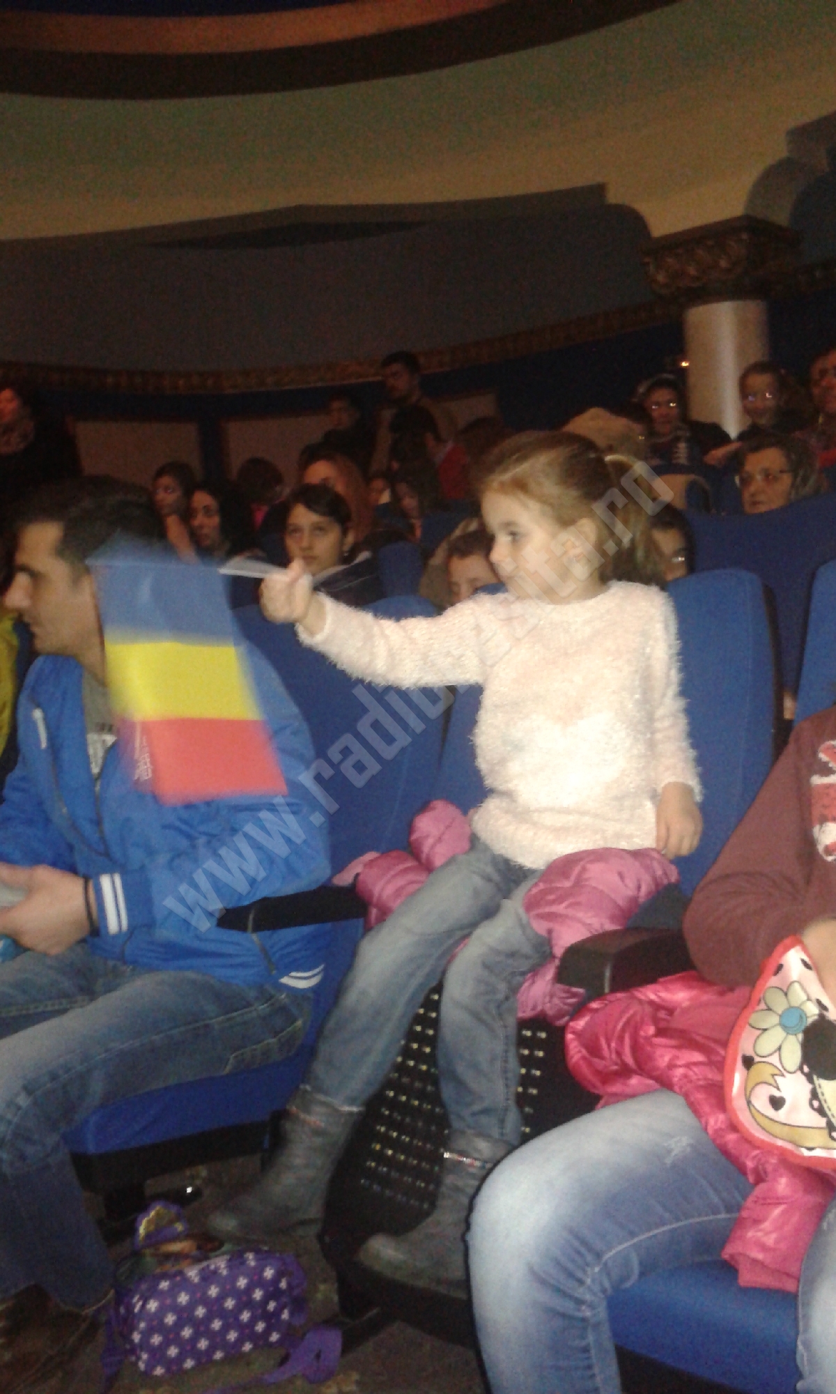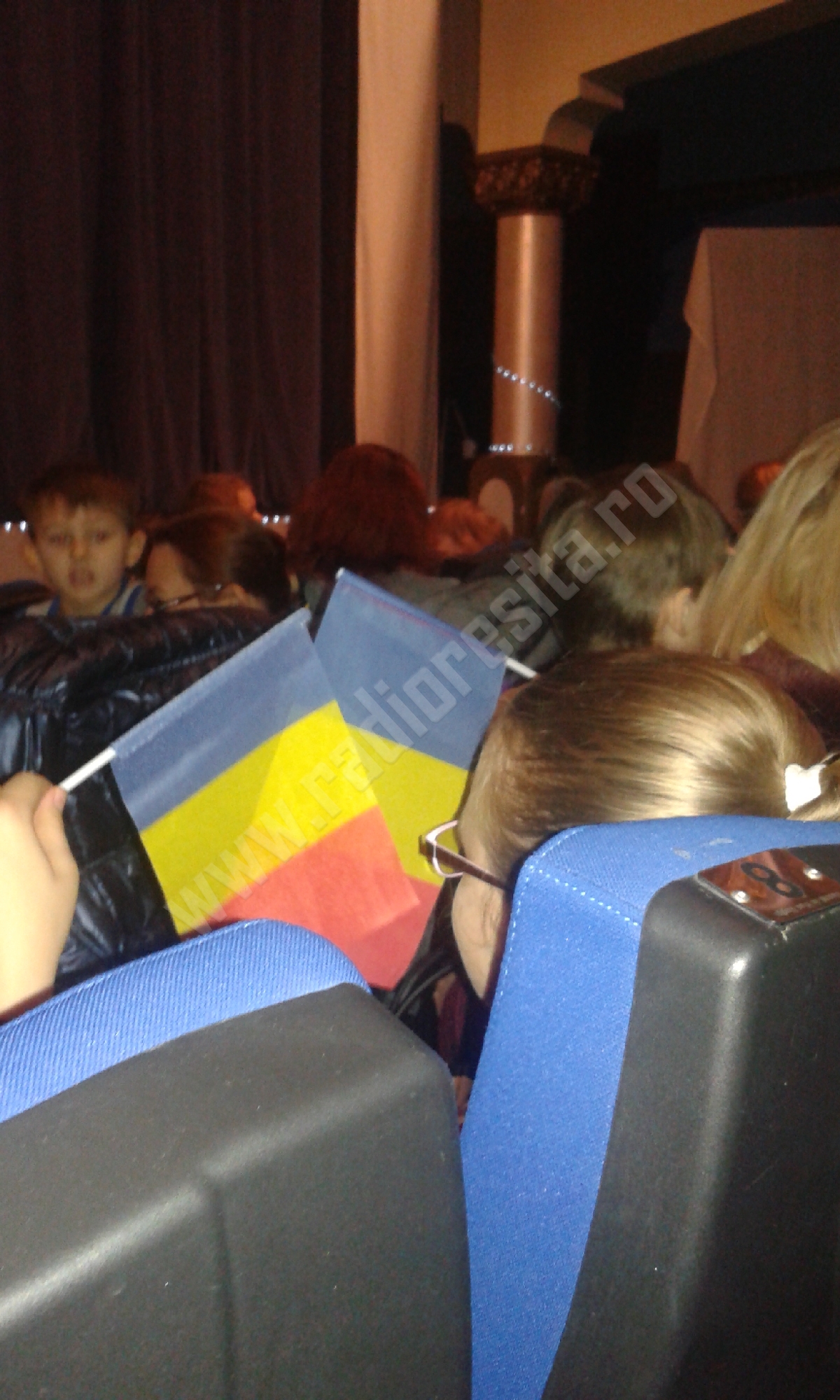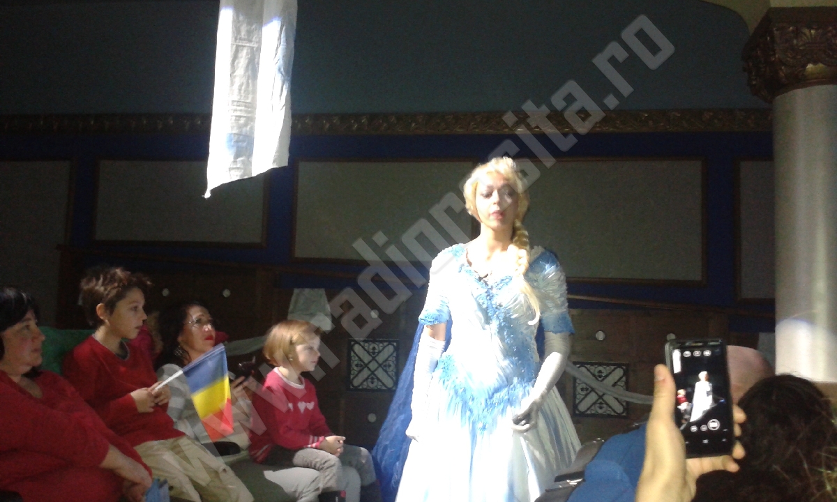 Radio România Reşiţa a dăruit şi astăzi steguleţe. De această dată, zeci de copii, părinţi şi bunici au avut surpriza ca înainte de a intra în sala de spectacole a Teatrului de Vest din Reşiţa să fie întâmpinaţi de echipa Radio Reşiţa, care le-a înmânat fiecăruia steguleţe, şi aceasta în preajma Zilei Naţionale a României. Astăzi a avut loc premiera piesei FROZEN. Sosite tocmai din tărâmurile de gheaţă, Elsa şi Ana au fost întâmpinate cu aplauze şi cu tricolorul, fluturat de cei aproape 200 de copii. Sala de spectacole a Teatrului de Vest a fost arhiplină, piesa jucându-se cu casa închisă. Copiii, dar şi adulţii au savurat povestea din ţinuturile nordice şi au aplaudat îndelung prestaţia tinerilor actori. Cei care nu au mai găsit bilete, pot viziona spectacolul în data de 13 decembrie. Mâine actorii vor bucura şi copiii din Deva, acolo unde vor ajunge Elsa şi Ana, alături de prietenii lor. Fluturând tricolorul, copiii, părinţii şi bunicii au avut surpriza să observe, la ieşirea de la spectacol, că Elsa a adus fulgi de nea şi la Reşiţa.
