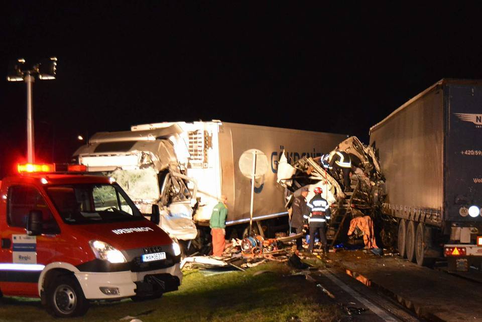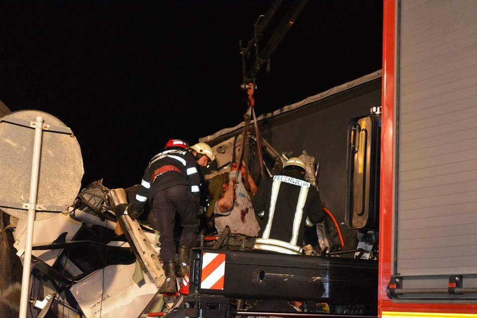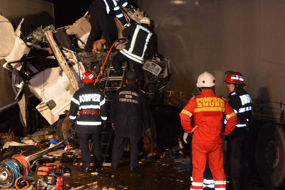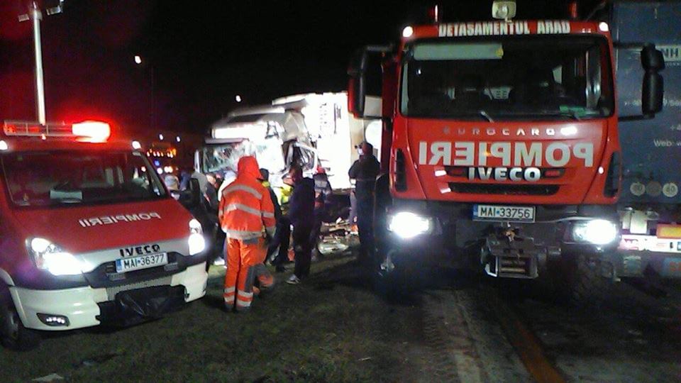 Scene desprinse din filmele de groază aseară pe centura Aradului. Trei TIR-uri s-au ciocnit, iar impactul a fost devastator. O persoană a decedat, în timp ce altele două sunt grav rănite.