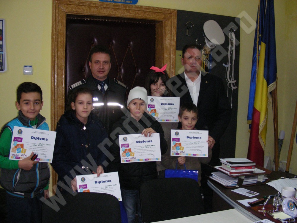 Poliţia oraşului Băile Herculane şi Liceul HERCULES au organizat astăzi o serie de întâlniri între elevi şi poliţiştii Formaţiunii Rutiere şi Formaşiunii de Ordine Publică, în care au fost prezentate aspecte privind comportamentul elevilor în trafic, atât în calitate de pietoni, cât şi de conducători auto, mopede sau biciclete, în cadrul săptămânii ŞCOALA ALTFEL. De asemenea, membrii patrulei de circulaţie rutieră care acţionează la nivelul claselor I-IV au participat la un concurs pe teme rutiere, în care au avut de răspuns unui chestionar din legislaţia în vigoare. Pentru rezultatele obţinute, dar şi pentru buna colaborare din timpul anului şcolar, comandantul Poliţiei oraşului Băile Herculane – subcomisarul Radu Ştefan i-a recompensat pe micii poliţişti cu diplome şi diverse articole purtând însemnele săptămânii ŞCOALA ALTFEL.