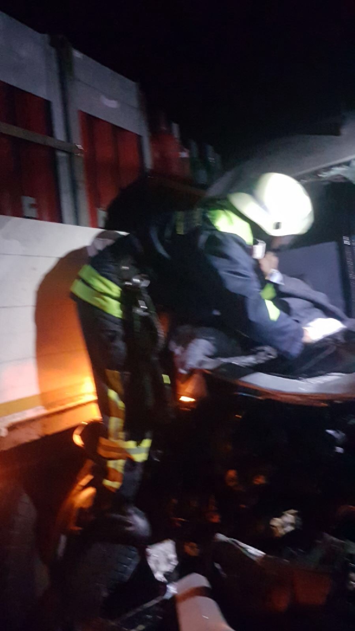 Şoferul încarcerat a fost extras din cabină şi predat, în stare de conştienţă unui echipaj de la Serviciul Judeţean de Ambulanţă Timiş. În autotren se afla șoferul și un pasager, dar aceştia nu au păţit nimic în urma coliziunii.