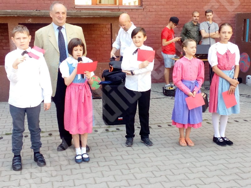 Cantautorul, poetul şi jurnalistul Ovidiu Scridon din Bucureşti, prezent în mijlocul elevilor reşiţeni, a susţinut un microrecital în curtea unităţii de învăţământ. El a interpretat imnul Europei la muzicuţă: