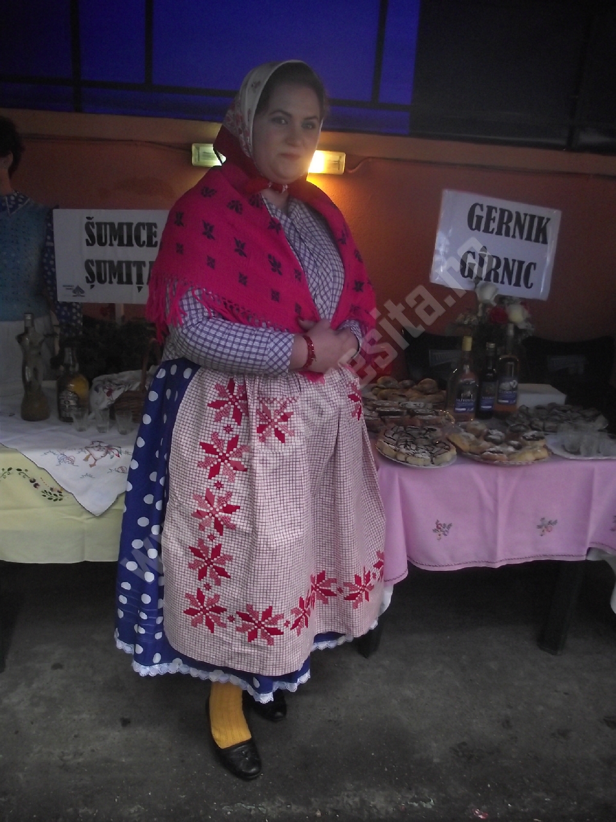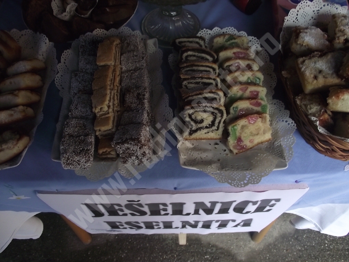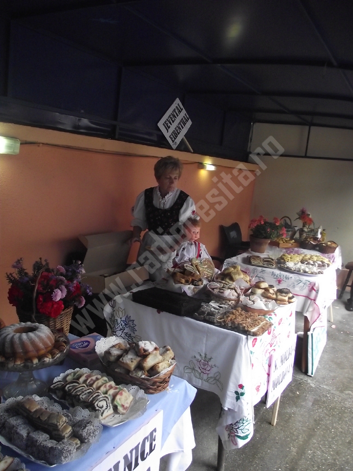 „Am adus cornuri, colaci cu mac şi cu brânză dulce, cozonac cu mac, nişte struguri şi ţuică! Prăjiturile sunt după reţete vechi, cu produse noi!”, ne-a precizat Terezia Pincova din Ravenska. „Este specialitatea străbunicilor mei : prăjituri cu brânză dulce, cozonac cu mac şi nucă, vişinată şi ţuică făcută din miere de albine! Cea mai bună prăjitură e, cum se spune la noi, colace, făcută cu brânză dulce şi nucă deasupra!”, ne mărturiseşte Maria Cusca din Gârnic. „Am venit azi cu gogoşi, cum spunem noi la Şumiţa, dar cotăriţa era plină şi acum a mai rămas doar unul! Gogoşii se fac din făină, ouă, smântână, pus lapte, zahăr… Asta-i reţetă de la bunica mea şi cât trăim noi facem!”, ne spune Antonia Olteanu de la Şumiţa.