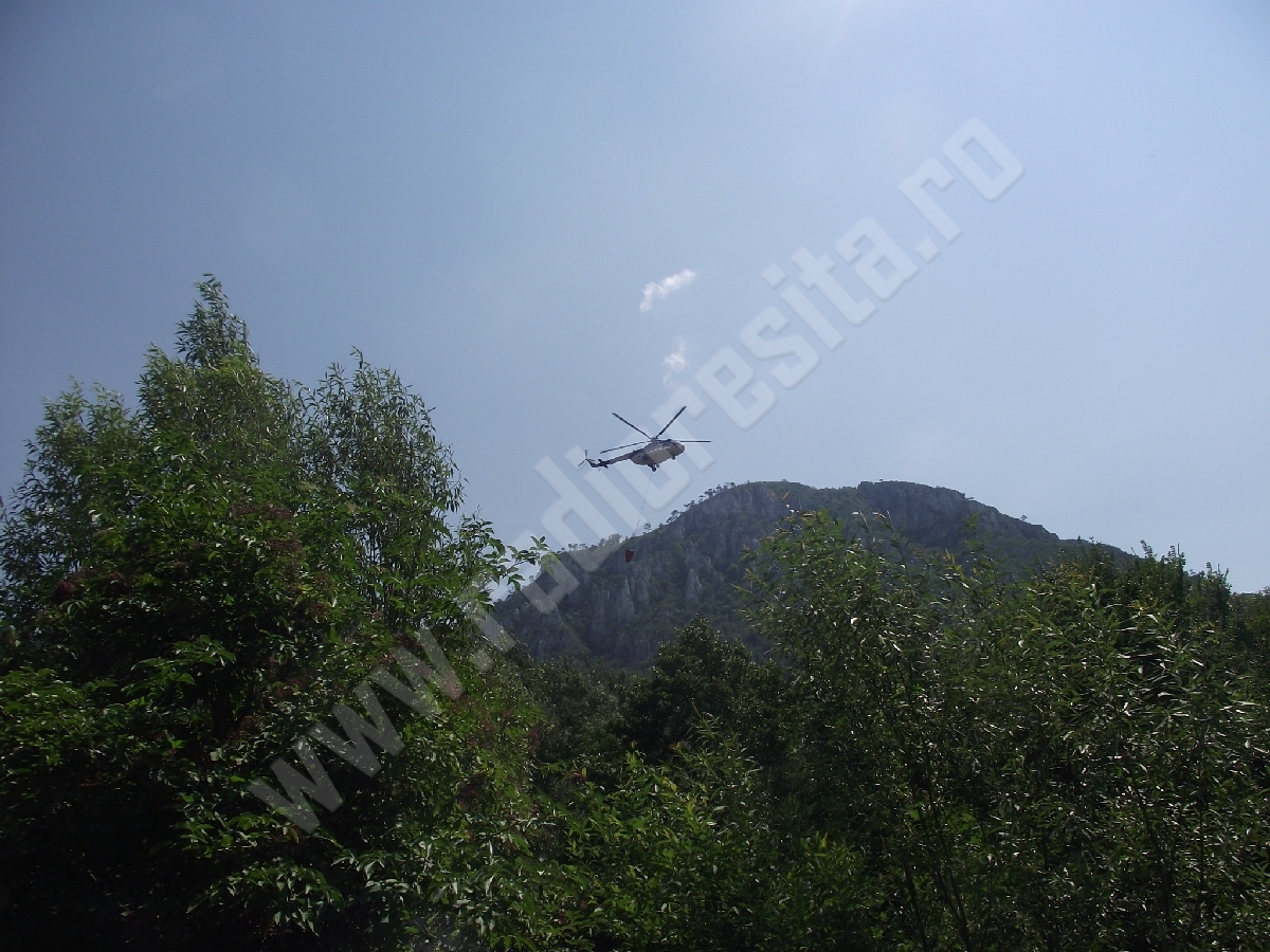 Elicopterul face faţă destul de greu situaţiei din teren, trebuind să se alimenteze cu apă din barajul Lacului Prisaca – de la km 5 pe Valea Cernei. „Este mult de muncă, am făcut doar trei treceri… Din cauza zonei şi a limitei de combustibil, elicopterul s-a dus acum să alimenteze şi vom continua după-amiază. Dacă este cazul, elicopterul va acţiona şi în zilele următoare, nu va pleca până nu stingem incendiul! Intervenţia în teren este grea şi de asta am apelat şi la forţele aeriene, pentru că este zona este foarte greu accesibilă cu piciorul!”, ne-a mărturisit locotenent-colonelul Marius Gogâltan.